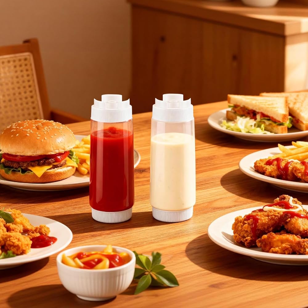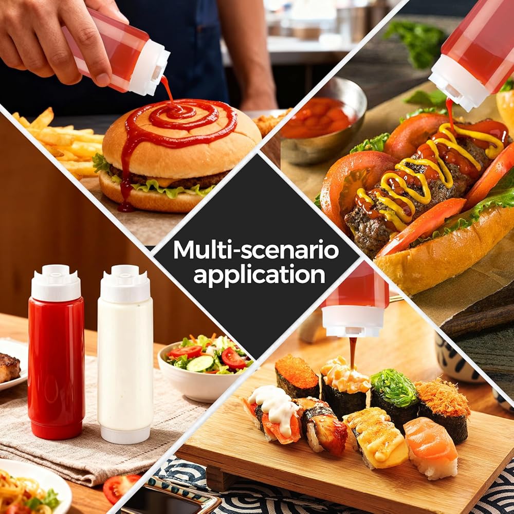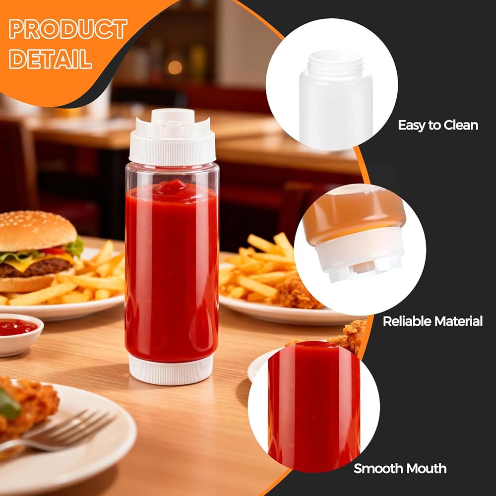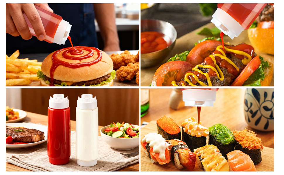 تصميم شفاف وفعال: يتيح لك الجسم الشفاف لزجاجات بهارات المطاعم زجاجة ضغط بلاستيكية مقلوبة مراقبة المحتويات في لمحة، بينما تسمح الفتحات المزدوجة بملء أسهل وتنظيف وتقليل نفايات الصلصة.