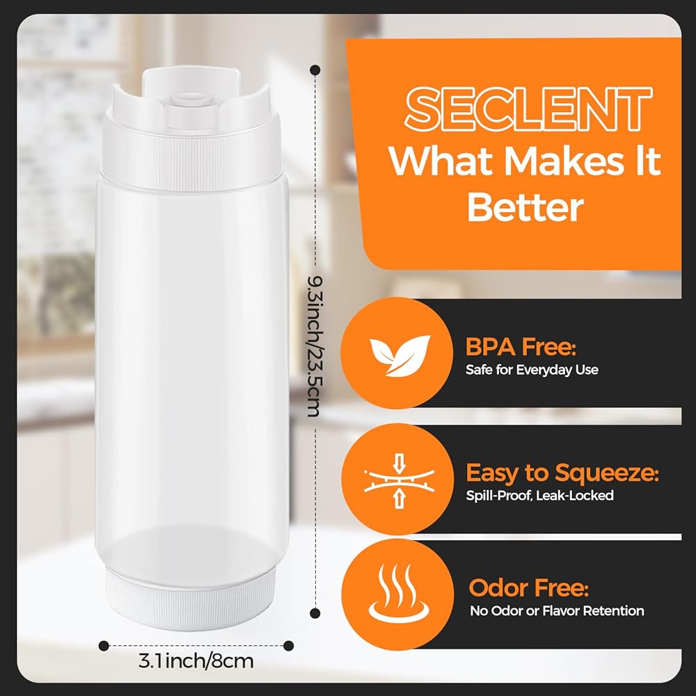 سعة كبيرة 32 أونصة: يبلغ حجم كل زجاجة ضغط للصلصات سعة 32 أونصة 9.3 × 3.1 بوصة وتتحمل ما يصل إلى 32 أونصة، مما يوفر حجمًا كبيرًا مثاليًا للاستخدام الشخصي والتجاري.
