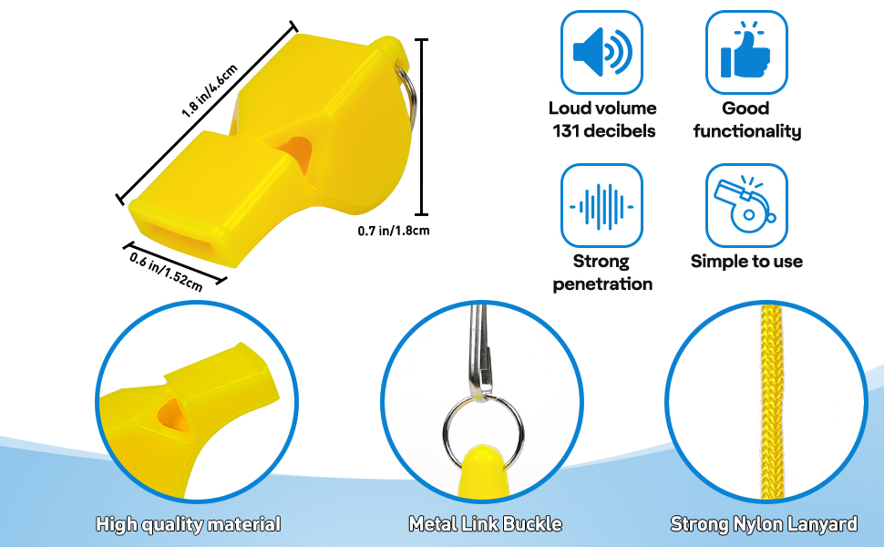 سهلة الاستخدام: من أجل الراحة، قمنا بتجهيز كل صافرة رياضية بسلك نايلون ناعم يبلغ 45.7 سم / 18 بوصة (بعد طيها)، والذي يمكنه تحرير يديك وتعليقها بسهولة حول رقبتك.