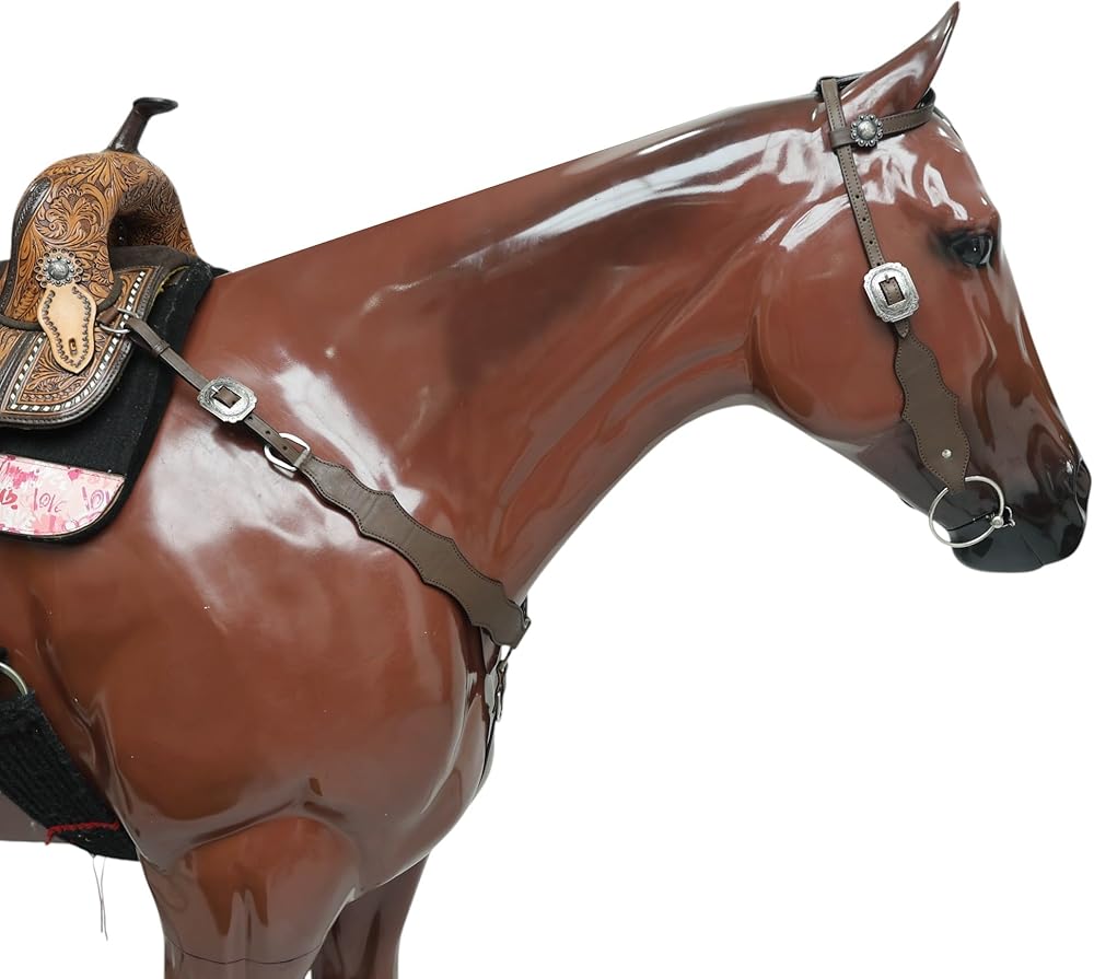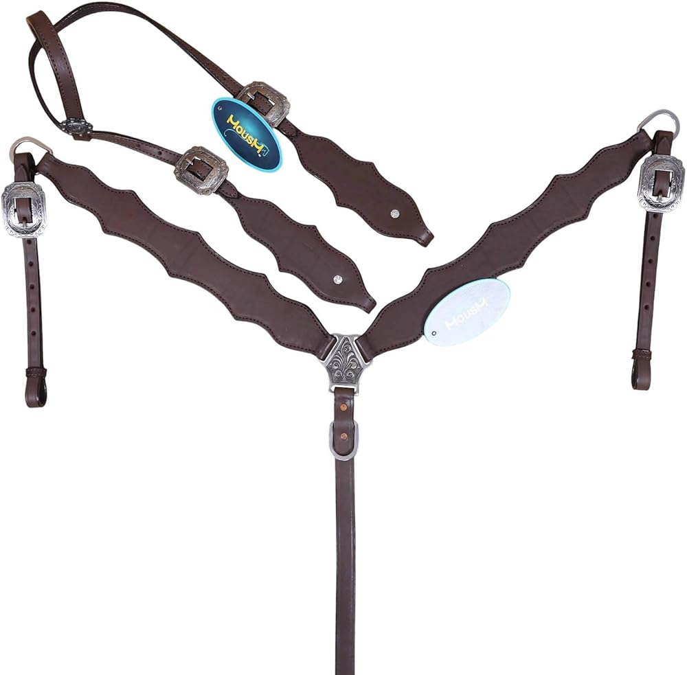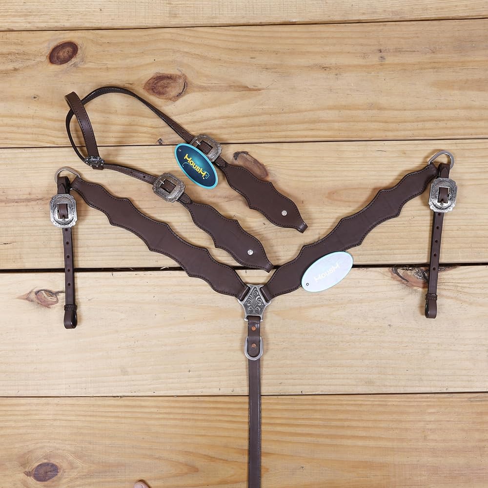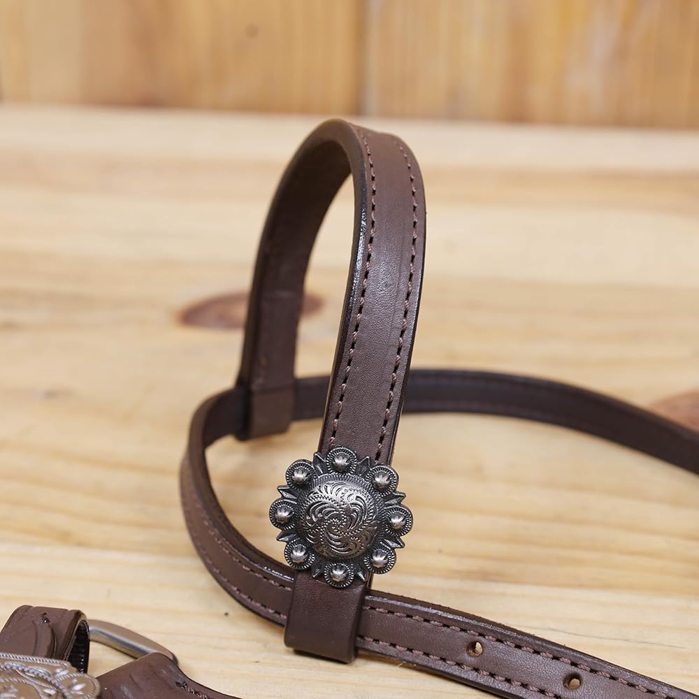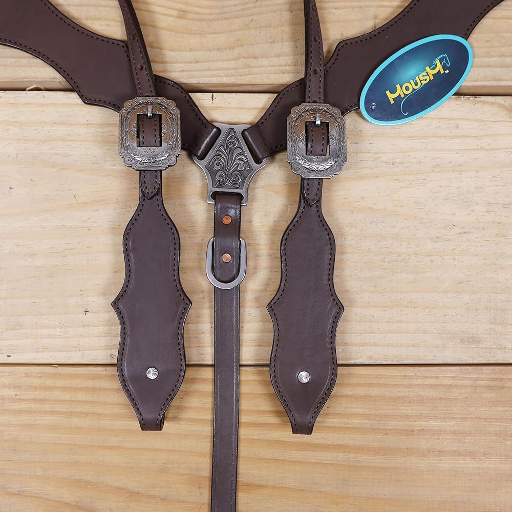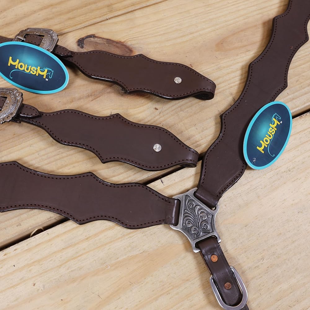 One of the best creations by MOUSM, this Western Leather Headstall and Breast Collar Tack Set is crafted in smart plain dark brown leather, blending durability with timeless Western style. Made from genuine Argentina cow leather, it offers a smooth texture, high strength, and comfort for your horse. The set includes antique nickel hardware and copper rivet buckles, adding a vintage charm to its premium construction. Handcrafted by skilled artisans, it is designed for riders who value quality and style. Perfect for racing days, casual rides, or as a thoughtful gift for your horse lover, this tack set truly brings out the winner's feel.