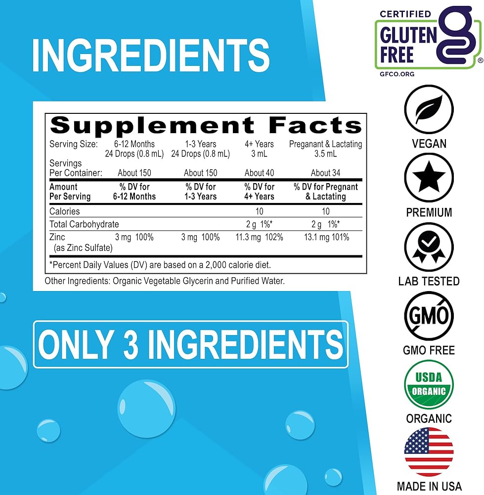 قطرات سهلة الاستخدام: سوف تحب الزنك العضوي غير المنكه للأطفال بدلاً من الكبسولات؛ قطرات الزنك السائل النقي مثالية للبالغين والأطفال والأطفال الصغار والرضع بعمر 6 أشهر وما فوق في شكل الزنك الأيوني السائل