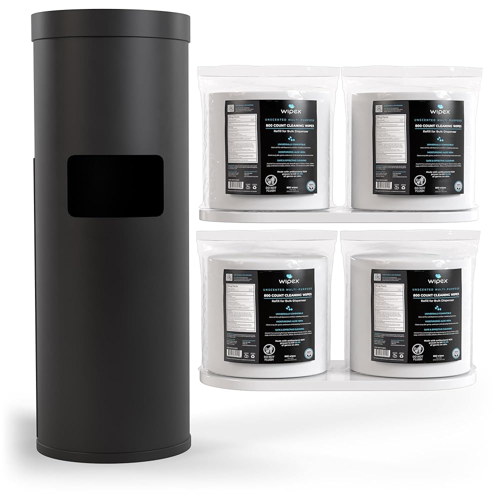 حزمة مناديل Wipex Gym: موزع مناديل أسود مع سلة المهملات - فولاذ مقاوم للصدأ متين، 4 × 800 قيراط مناديل معقمة لصالة الألعاب الرياضية لإعادة ملء المعدات لاستخدامها في المدرسة والمكتب وصالة الألعاب الرياضية والأماكن العامة