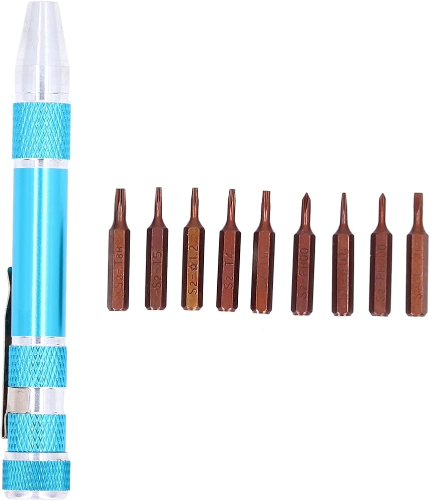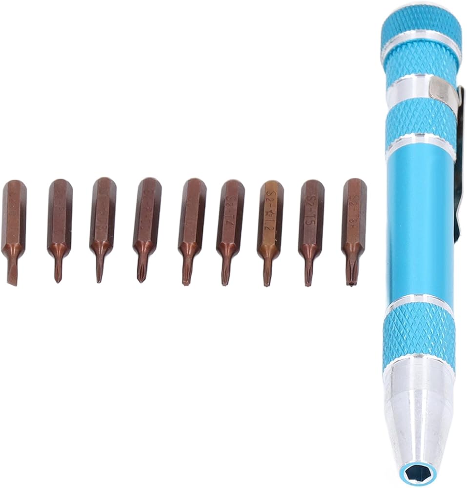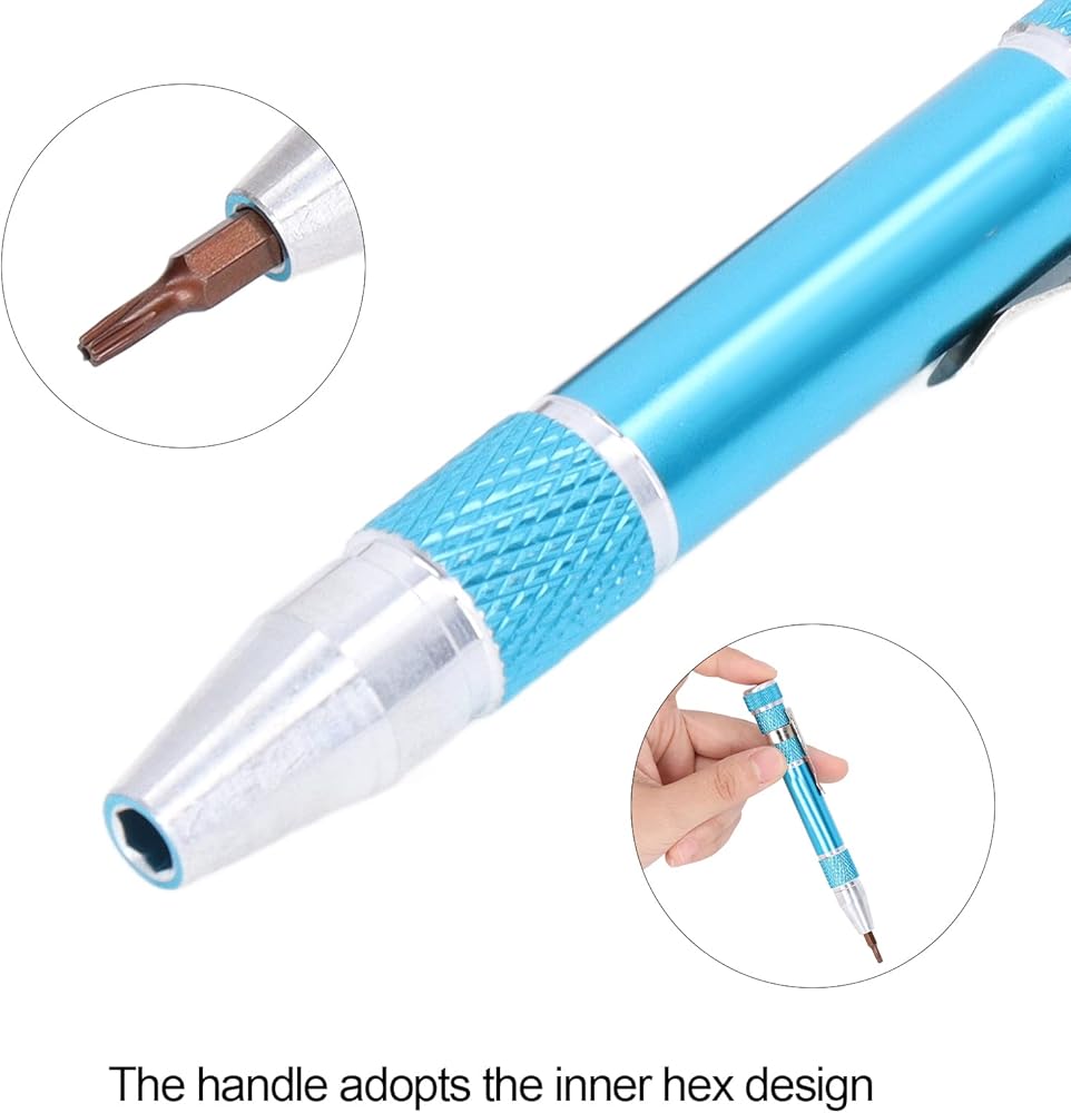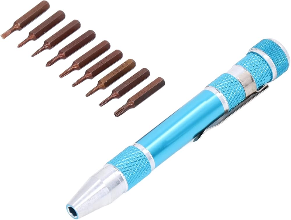 Pocket screwdriver featuring a secure bit connection thanks to its innovative inner hex design infused , ensuring a robust hold that prevents accidental detachment or slipping during use, thereby enhancing work efficiency. Crafted in a sleek pen-style form factor, this mini screwdriver boasts unparalleled portability, clipping effortlessly onto clothing pockets for on-the-go convenience. Equipped with a versatile assortment of 9 precision-engineered bits, tailored to address diverse fastening requirements, this micro screwdriver caters to even the most challenging tasks. Constructed from a premium blend of lightweight aluminum alloy and robust alloy steel, it offers a fusion of strength, resistance, and durability, ensuring long-lasting performance under demanding conditions. Ideal for a wide array of applications, this screwdriver pen excels at disassembling and reassembling electronic devices and components, making it a must-have tool for technicians and professionals alike.
