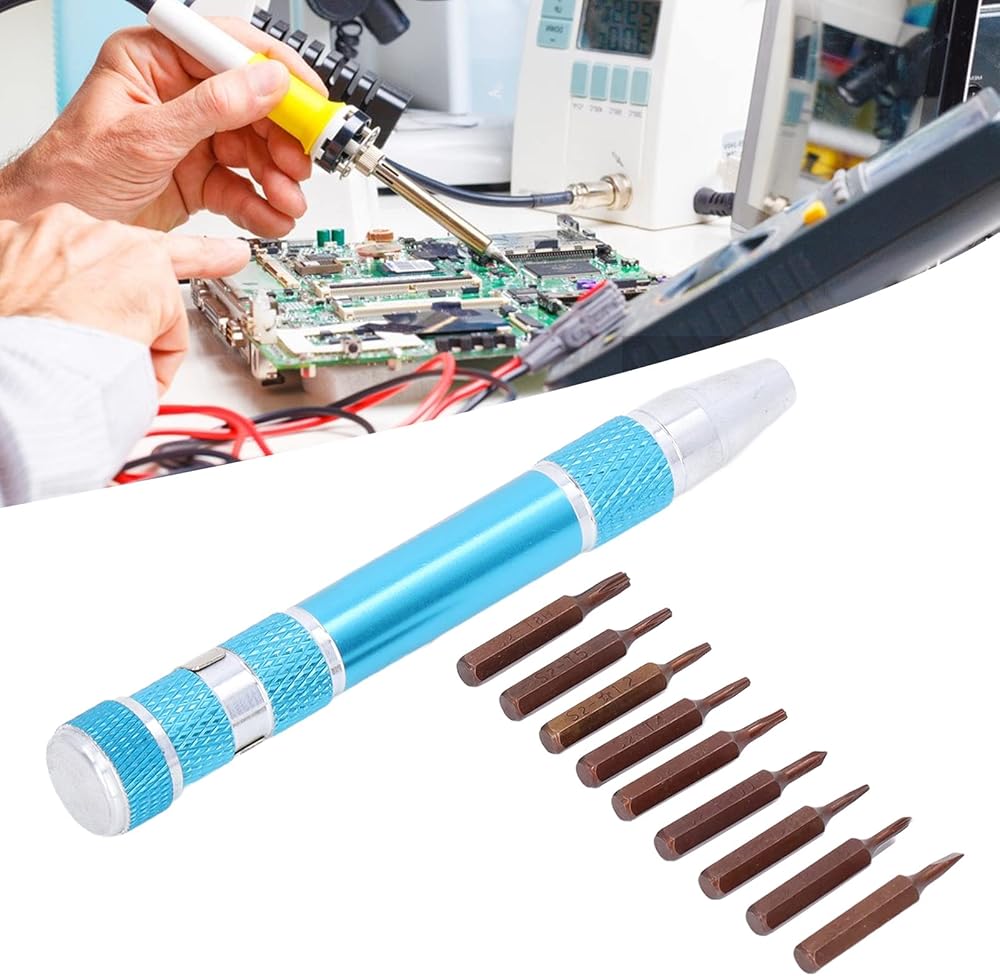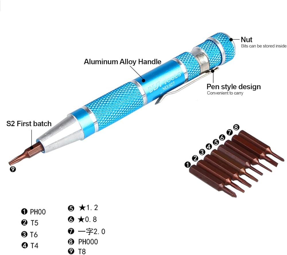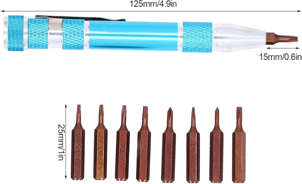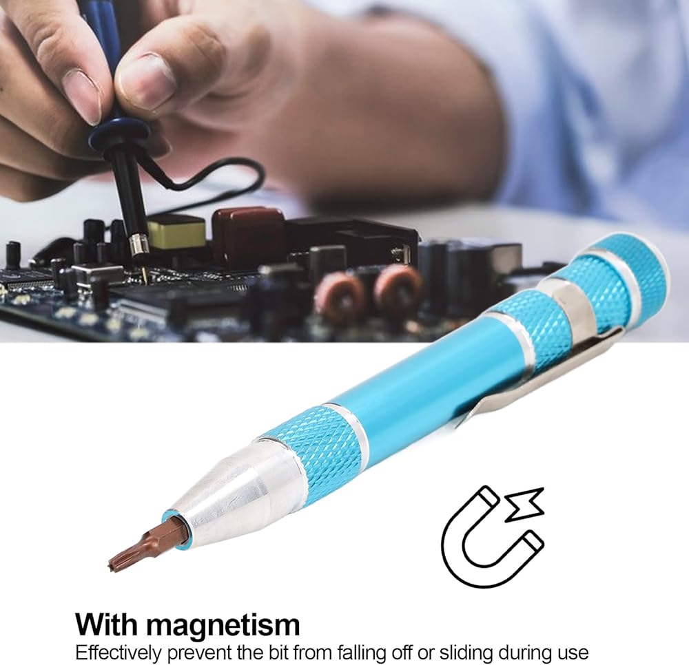 Pocket screwdriver featuring a secure bit connection thanks to its innovative inner hex design infused , ensuring a robust hold that prevents accidental detachment or slipping during use, thereby enhancing work efficiency. Crafted in a sleek pen-style form factor, this mini screwdriver boasts unparalleled portability, clipping effortlessly onto clothing pockets for on-the-go convenience. Equipped with a versatile assortment of 9 precision-engineered bits, tailored to address diverse fastening requirements, this micro screwdriver caters to even the most challenging tasks. Constructed from a premium blend of lightweight aluminum alloy and robust alloy steel, it offers a fusion of strength, resistance, and durability, ensuring long-lasting performance under demanding conditions. Ideal for a wide array of applications, this screwdriver pen excels at disassembling and reassembling electronic devices and components, making it a must-have tool for technicians and professionals alike.