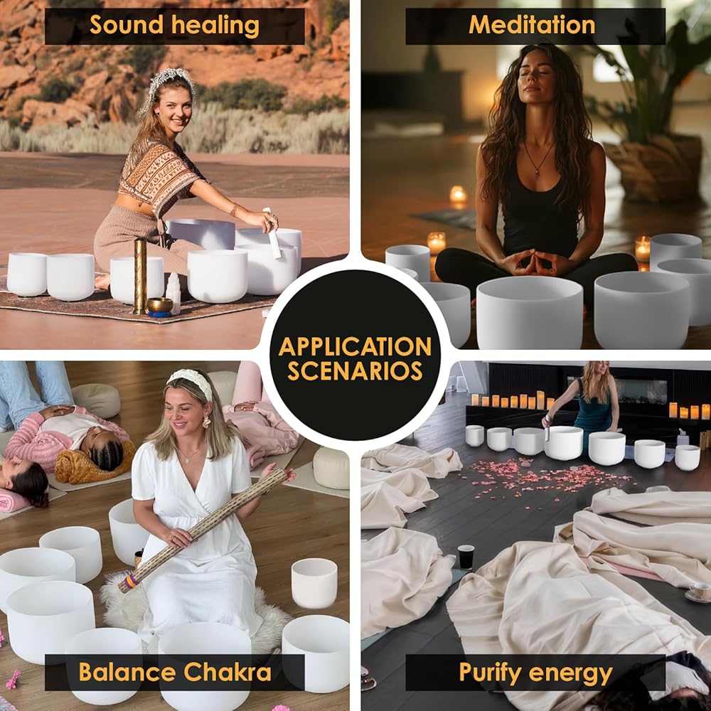 الفوائد: تعمل أوعية الغناء الكريستالية لدينا على تعزيز الاسترخاء والتركيز والتوازن أثناء التأمل واليوجا وشفاء الشاكرا. تعمل على توازن الذبذبات وإزالة الانسدادات في مراكز الطاقة بالجسم، مع تحفيز الدماغ على الإبداع والإلهام