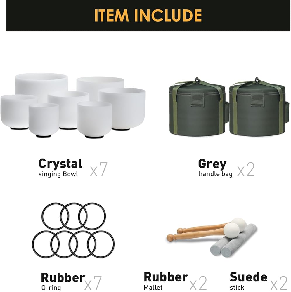 تشمل العناصر: 7 قطع من وعاء الغناء الكريستالي 432 هرتز 6 بوصة - 12 بوصة (12 بوصة جذر، 11 بوصة سرة، 10 بوصة ضفيرة شمسية، 9 بوصة قلب، 8 بوصة حنجرة، 7 بوصة عين ثالثة، 6 بوصة تاج)، قطعتان من حقائب الحمل، قطعتان من المطارق المصنوعة من الجلد السويدي، قطعتان من المطارق المطاطية، 7 قطع من الحلقات المطاطية على شكل حرف O