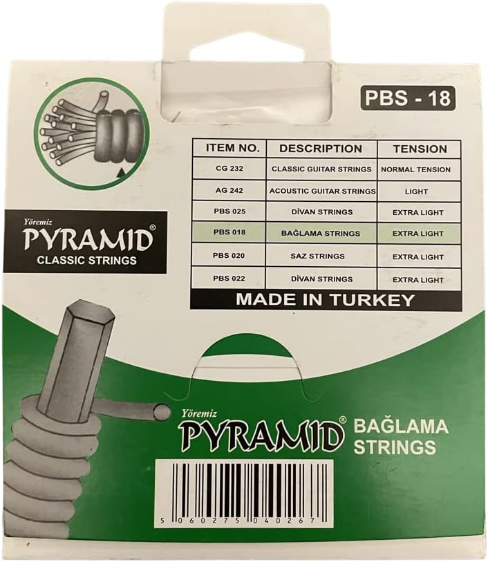 It is advised that you should replace the strings on your baglama every 3-4 months. Short String Baglamas use 0.18 mm strings while Long Neck Baglamas are better suited for 0.20 mm. There are three types of strings for baglamas: Pyramid-type, Chrome and Steel strings. The Yoremiz brand is a generic baglama string brand that is considered medium quality. It is made in Turkey and each pack contains 7 pyramid-type strings which are: 1 upper bam string in 0.5 mm thickness (white) and 1 lower bam string in 0.4 mm (also in white coating). 2 Strings of 0.28 mm thickness and 3 strings of 0.18 mm.