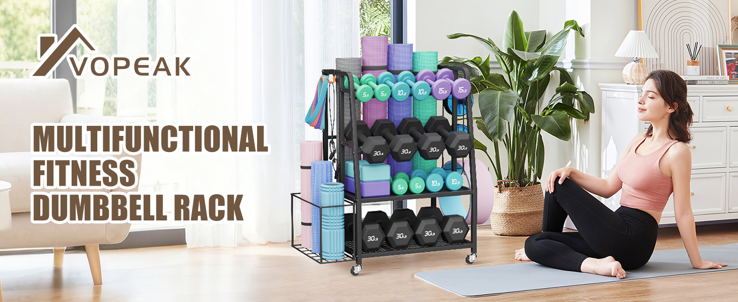 حامل دمبل من VOPEAK لصالة الألعاب الرياضية المنزلية، حامل حامل وزن قابل للتعديل مع عجلات، منظم تخزين فولاذي شديد التحمل للدمبل وحصيرة اليوغا، مع عجلات قفل وخطافات جانبية