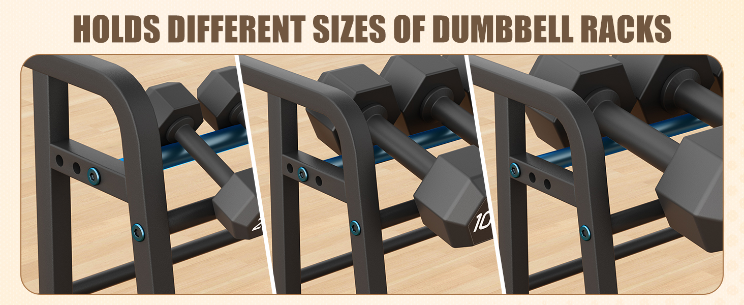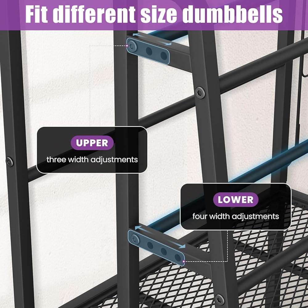 نظام تخزين الدمبل القابل للتعديل بدقة: على عكس الرفوف ذات العرض الثابت، يتميز رف الدمبل هذا بآلية تعديل موضع الثقب التي تتيح لك تخصيص المسافة بين الأنابيب الفولاذية المستديرة. توفر الطبقة الأولى 3 إعدادات للعرض (90/115/145 مم)، وتوفر الطبقة الثانية 4 إعدادات (90/115/145/175 مم) لاستيعاب عروض قبضة الدمبل المختلفة. كل وزن يبقى بأمان دون أن يتدحرج، مما يمنحك حامل وزن مخصص حقًا للدمبل في صالة الألعاب الرياضية المنزلية.