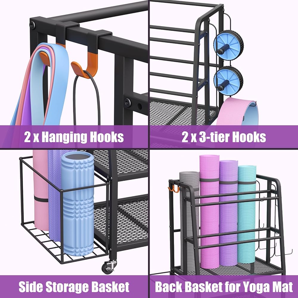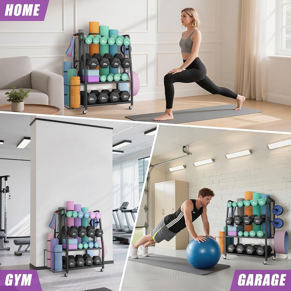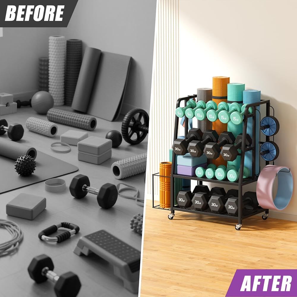 تنظيم كامل لصالة الألعاب الرياضية المنزلية في وحدة واحدة: هل سئمت من فوضى التمرين؟ نظام تخزين الصالة الرياضية المنزلي هذا يتجاوز مجرد حامل الدمبل الأساسي. تتميز بفتحة خلفية مخصصة لحصائر اليوجا، وسلة شبكية جانبية لبكرات الرغوة، ورفين واسعين للمنصة لأجراس الكيتلبل/كرات الدواء، بالإضافة إلى خطافات متعددة لأشرطة المقاومة والإكسسوارات. كل شيء له مكانه، مما يجعل تنظيم صالة الألعاب الرياضية في المنزل أمرًا سهلاً.