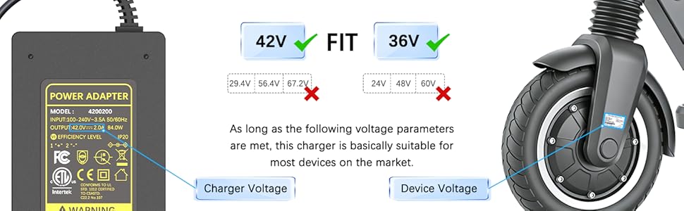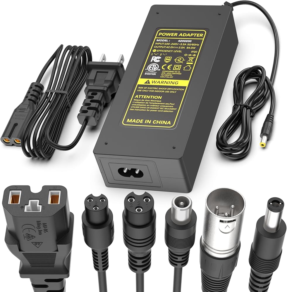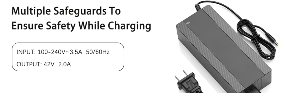 【شاحن سريع 42 فولت 2 أمبير】: الإدخال: 100-240 فولت 50/60 هرتز؛ الإخراج: 42 فولت 2 أمبير. شاحننا 42 فولت 2 أمبير مناسب فقط لحزمة بطارية ليثيوم أيون 36 فولت 10 ثانية. ملحوظة: ليس للبطاريات 24 فولت 25 فولت 48 فولت أو البطاريات الأخرى! لا تستخدمه لحزمة بطارية حمض الرصاص!