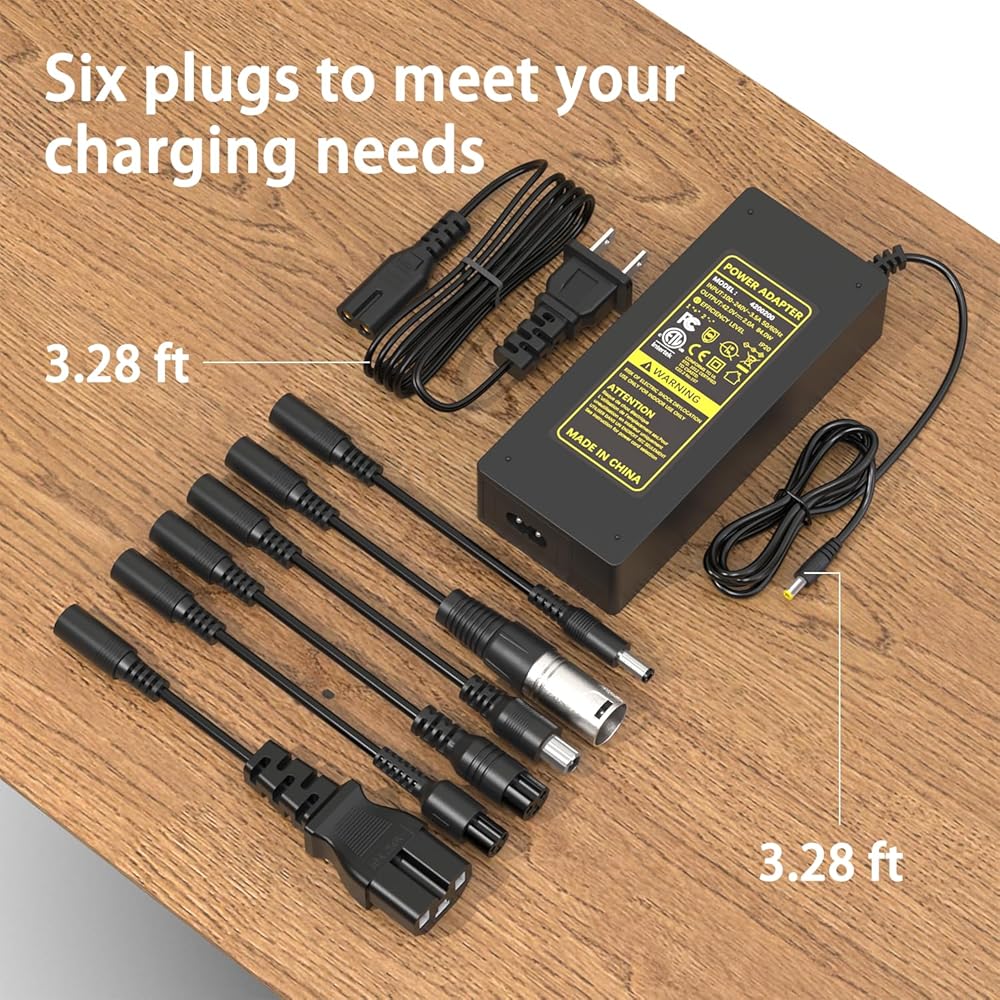 [موصلات عالمية 7 في 1]: شاحن عالمي 7 في 1 متوافق مع مجموعة واسعة من الدراجات البخارية الكهربائية وألواح الحوامات والدراجات والدراجات الإلكترونية المتوفرة في السوق. يتضمن 5.5 × 2.1 مم تيار مستمر + 6 محولات (5.5 × 2.5 مم تيار مستمر، 9 مم صغير 3-Prong، 12 مم قياسي 3-Prong، 8 مم RCA، 3-Pin XLR، Universal IEC). يرجى التحقق من حجم الموصل وجهد البطارية قبل الطلب!