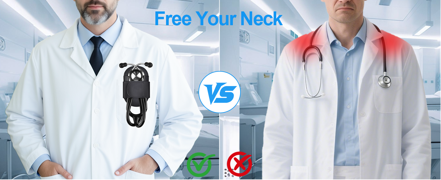 جيب جرس إضافي: يحل مشبك حامل سماعة الطبيب محل تعليق الرقبة التقليدي. يتميز بتصميم مشبك آمن، ويمكن ربطه بسهولة وأمان بالملابس أو الأحزمة أو أغطية التنظيف، مما يضمن سهولة الوصول إلى سماعة الطبيب طوال اليوم. من خلال التركيز على الارتداء المريح والوصول الفعال والمظهر الاحترافي، فهو يسمح للعاملين في مجال الرعاية الصحية بالتحرك بحرية ودون أي عائق أثناء المناوبات المزدحمة.