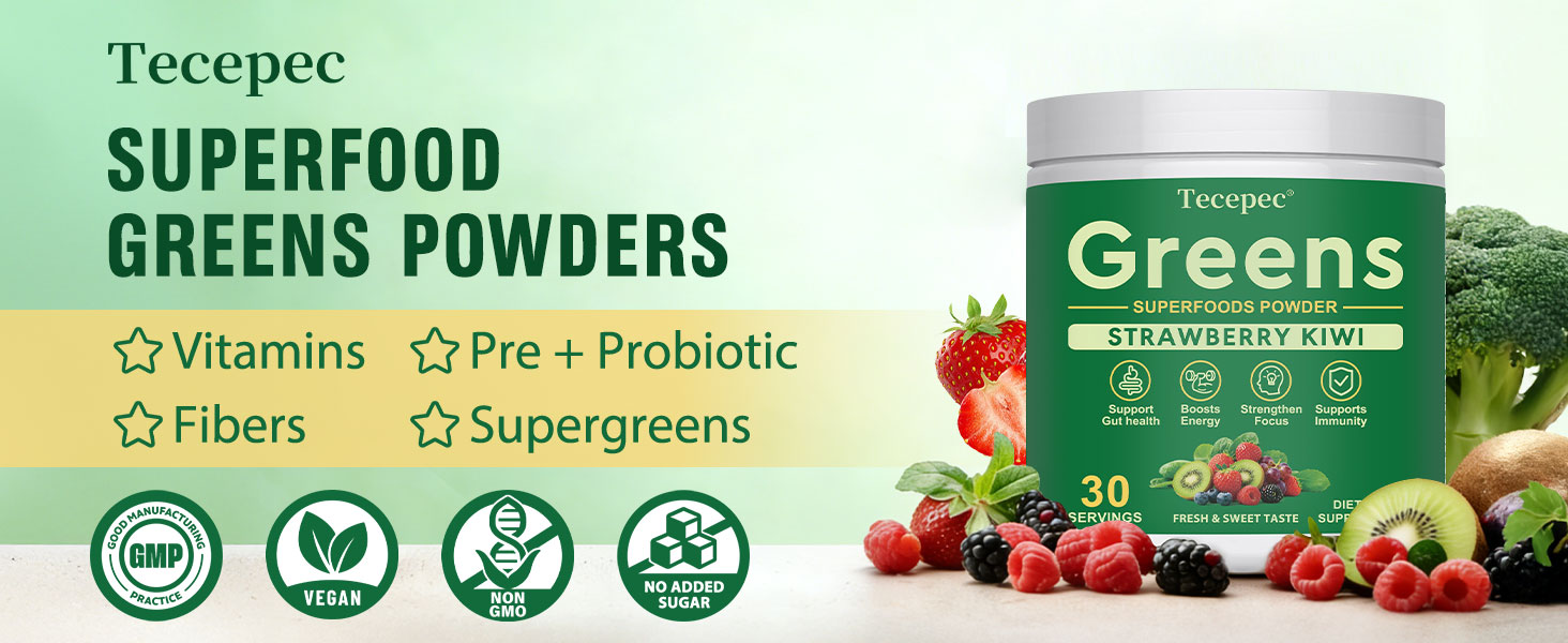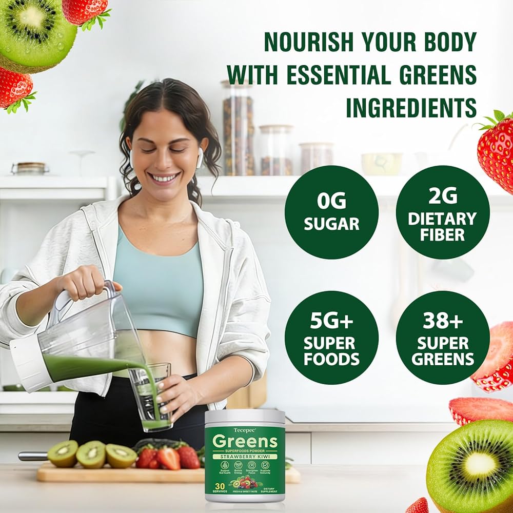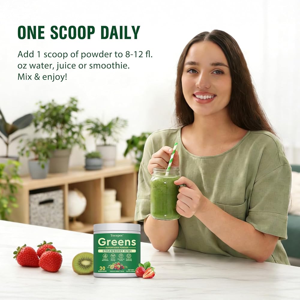 • نكهة نقية وحقيقية وطازجة: يختار Super Greens بعناية الفواكه الحقيقية كأساس للنكهة، بدون سكر مضاف وسعرات حرارية منخفضة. تجتمع الحلاوة الغنية للفراولة الناضجة مع نضارة الكيوي المشرقة والرائعة في تناغم تام، مما يوفر نكهة نقية ومنعشة بدون دهون أو ثقل. إنه منعش للغاية، مثل عصير الفاكهة الخفيف وجيد جدًا لدرجة أنك ستتطلع إلى شربه يوميًا! مغرفة واحدة فقط وتذوق الفرق في النكهة الحقيقية النقية!