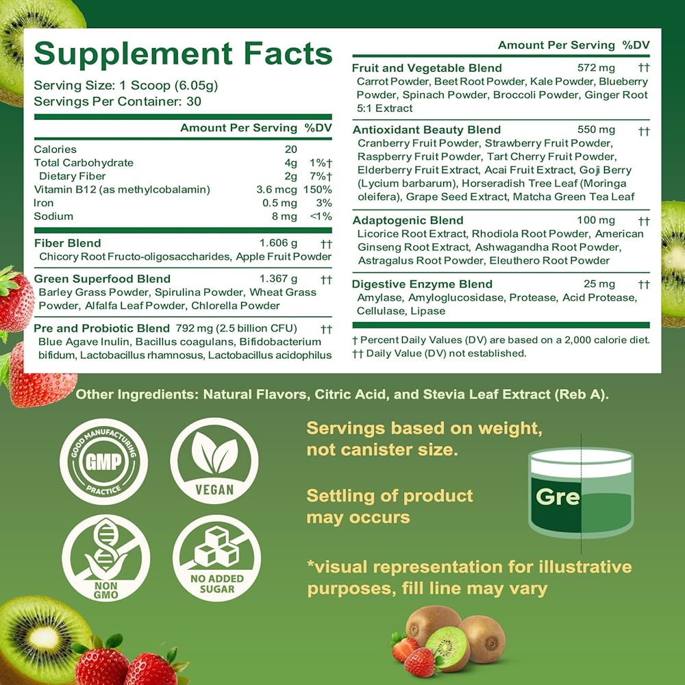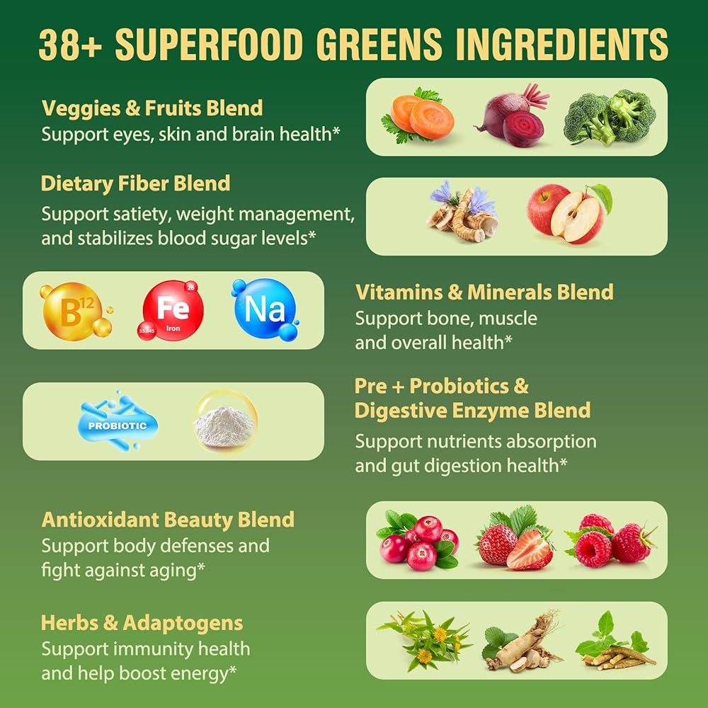 مسحوق سوبر جرينز سوبر فود، مزيج مشروب عصير الخضر مع سبيرولينا، والكلوريلا، والمواد المتكيفة والألياف، والإنزيمات الهاضمة، ومكمل ما قبل + البروبيوتيك للنساء والرجال الانتفاخ وصحة الأمعاء، 30 وجبة