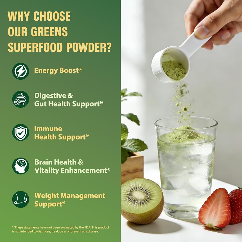 • ضمان الجودة والسلامة الذي لا هوادة فيه: يتم تصنيعه في منشأة معتمدة من GMP، ويستخدم مسحوق العصير الأخضر الخاص بنا فقط المكونات الغذائية الكاملة عالية الجودة. إنه خالي من الغلوتين ومنتجات الألبان والمكسرات ولا يحتوي على أي إضافات صناعية. تحافظ كل خطوة من عملية الإنتاج على مجموعة كاملة من المغذيات النباتية والمعادن، مما يضمن جودة ونضارة لا مثيل لها. مع كل حصة، فإنك لا تمنح جسمك سوى الخير النقي المعزز للصحة.