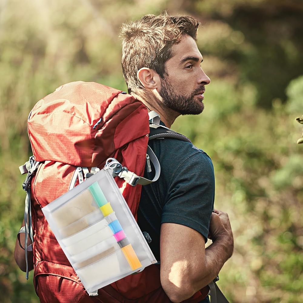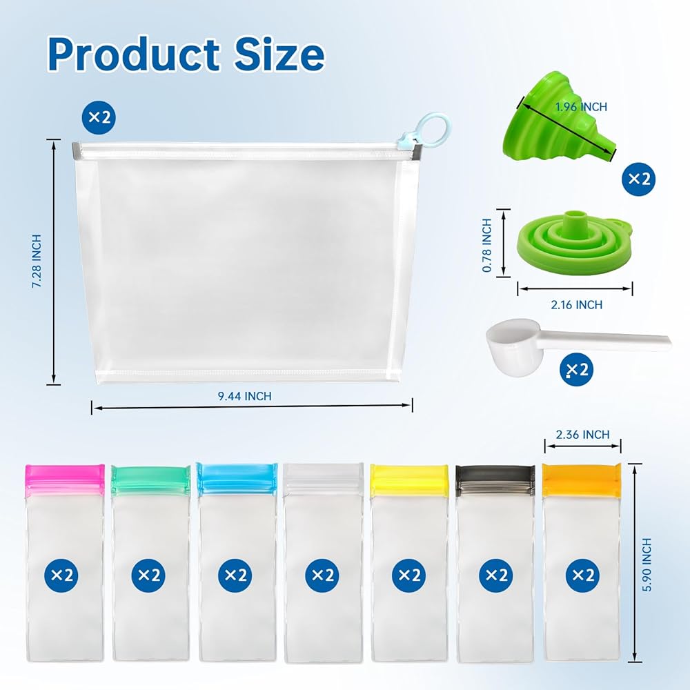 All-in-One Travel Supplement Set: Includes everything you need to stay organized on the go: 2 large storage bags (9.8” x 7”), 14 reusable color-coded single-dose pouches (2.35” x 5.9”), 2 wide-mouth funnels, 2 spoons, and label notes for easy tracking.