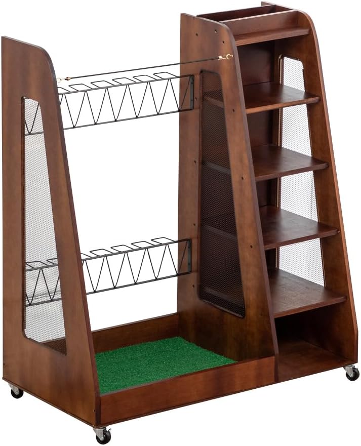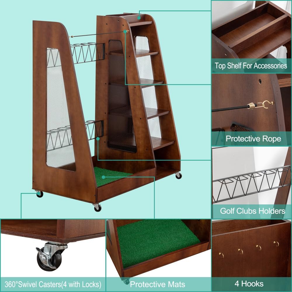 【 MULTI - FUNCTIONAL & MOBILE】This golf organizer is suitable for various locations, such as garages, home living rooms, and golf clubs. It comes with 4 wheels that can rotate 360°, allowing you to easily move it to any spot you want. And 2 of the wheels can be locked to ensure it stays stable when in place.