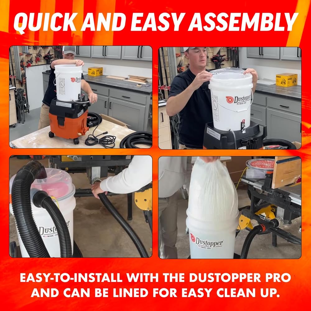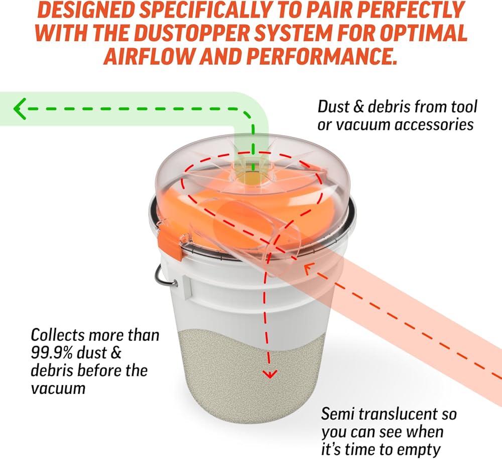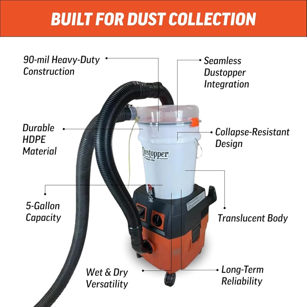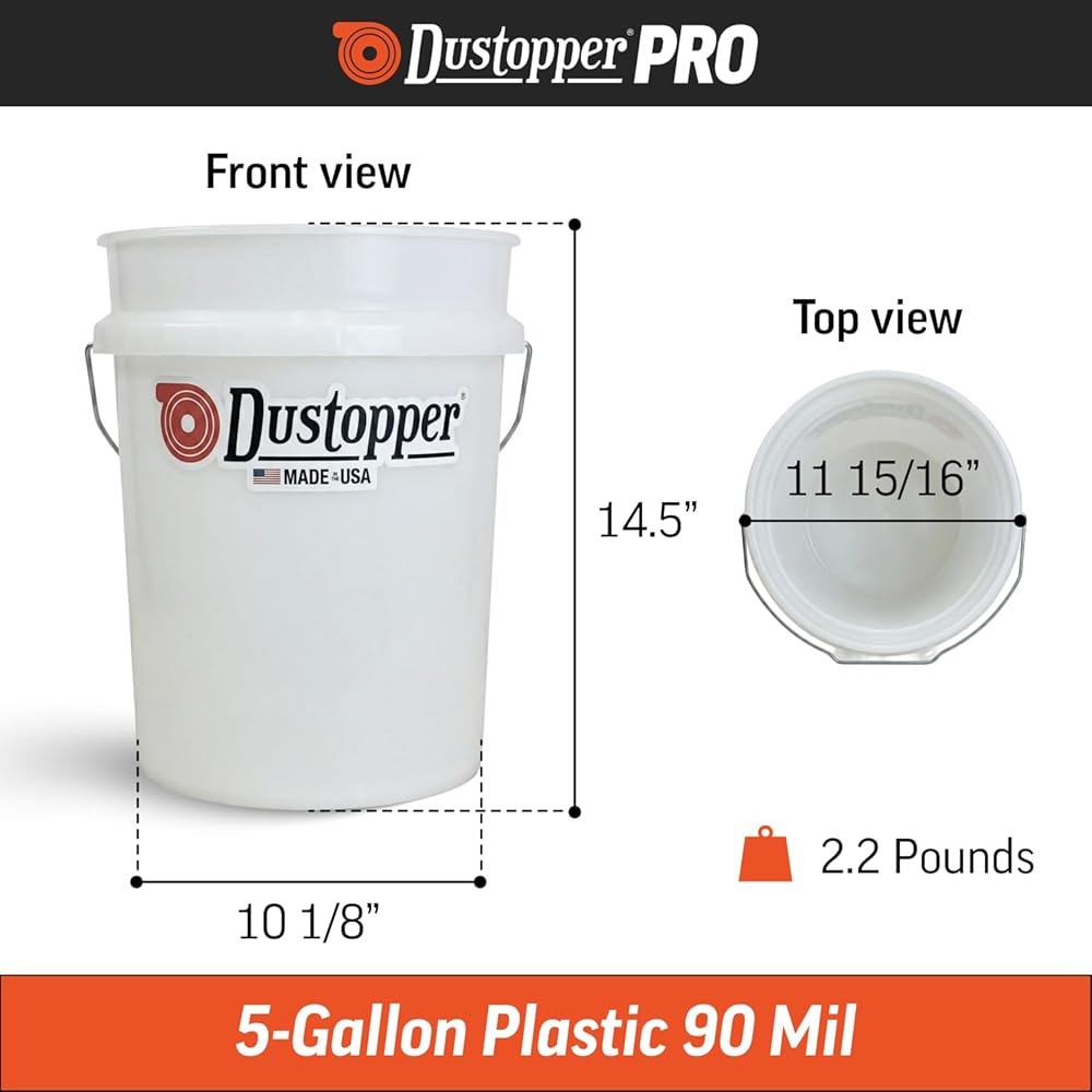 دلو عالي التحمل سعة 5 جالون و90 مل: دلو Dustopper عبارة عن سطل موثوق به سعة 5 جالون يمكن استخدامه لجمع واحتواء كل من الغبار والسوائل. الإضافة المثالية لنظام إدارة الغبار الرطب/الجاف والدلو الجديد للأعمال المنزلية وأعمال الفناء وورش العمل.