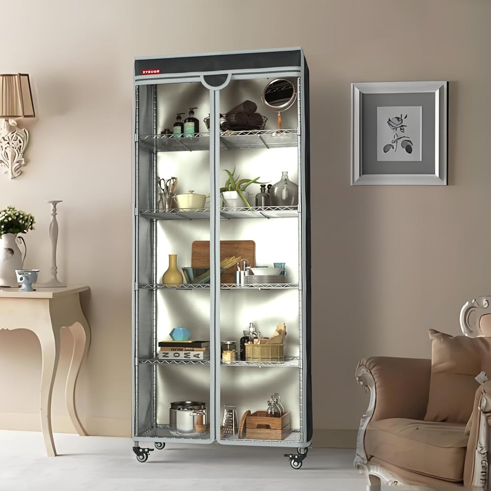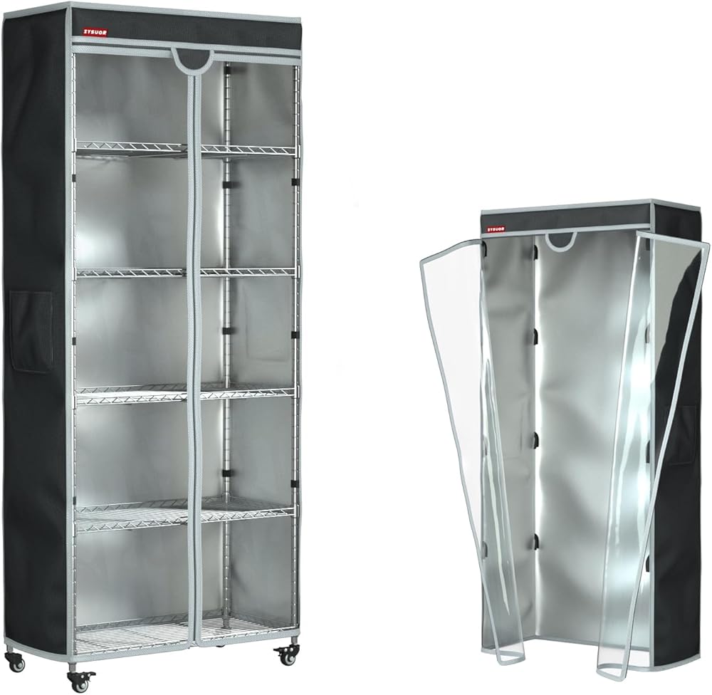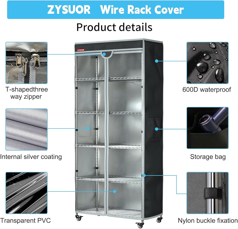 Keep your shelves neat, clean, and protected with the ZYSUOR Wire Shelving Cover 32.5"W x 16.5"D x 63"H. Designed with a T-shaped zipper front, this cover opens wide for quick and easy access to your items while keeping everything dust-free and dry. The clear PVC front panel lets you see what's inside without removing the cover. Made from heavy-duty waterproof Oxford fabric, it's built to last and ideal for both home and commercial use. Perfect for closet storage, garage organization, laundry rooms, basements, and pantries. Fits most wire racks, shelving units, and garment racks—a smart way to upgrade your storage space.