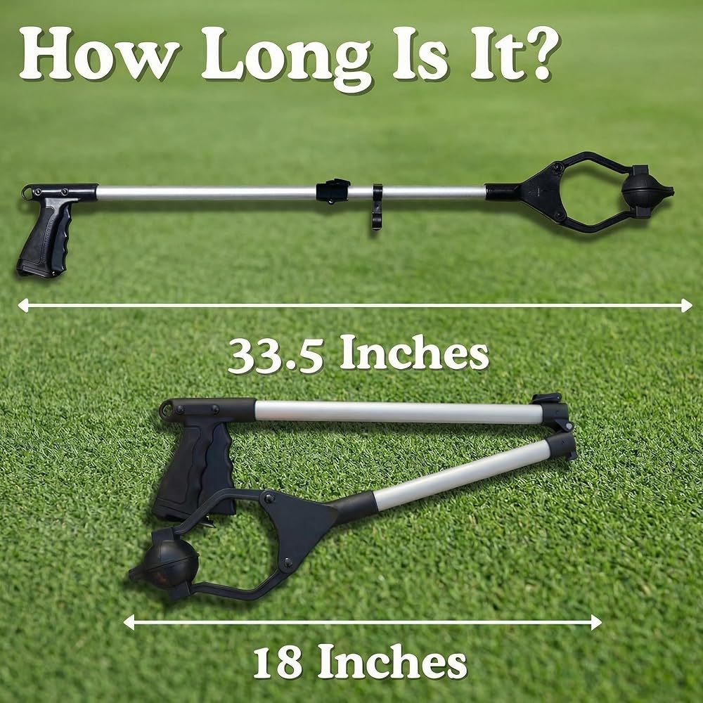 Our golf ball tee assistant measures 18 inches long but can be easily folded in half at only 9 inches long for storage in a golf cart bag. Our golf tee assistant is made to be the perfect height to never bend again, perfect for adaptive senior golfers or anyone who has trouble bending down while golfing. Easily squeeze handle of the golf tee assistant to clamp the golf ball and golf tee together and insert vertically into the ground. The non automatic golf ball tee up machine can also be used to pick up golf tees off the ground, or almost anything else you drop while playing golf that you can't bend down to pick up. Small American Owned USA Business.