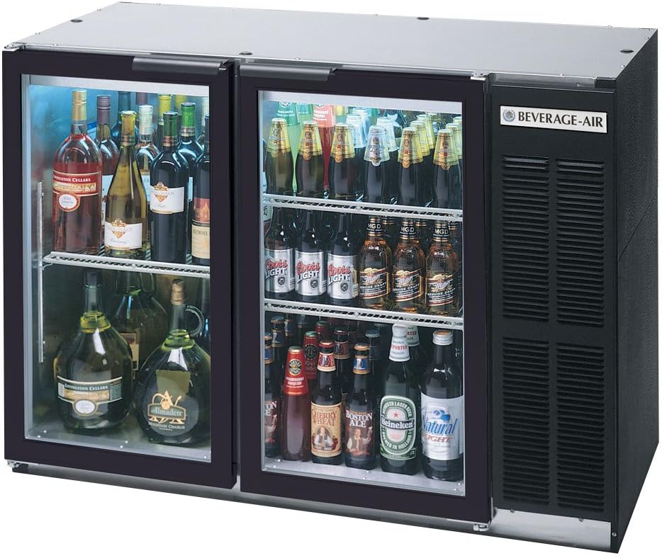Beverage-Air 48" Refrigerated Backbar Storage CabinetThis Beverage-Air Backbar Storage Cabinet is great for keeping cold drinks close at hand. It features a two-section design and has a black exterior finish and a galvanized top and interior. It comes with interior fluorescent lighting, and includes four epoxy coated shelves. This cabinet is UL and NSF listed. Two-section design Black exterior finish Galvanized top and interior Stainless steel floors Right-mounted self-contained refrigeration Interior fluorescent lighting with manual switch Includes (2) glass doors, (4) epoxy coated shelves Snap-in door gasket Can hold (2) 1/2 barrel kegs NSF and UL Listed Overall height: 34" Overall width: 48" Overall depth: 23.5" Model #: BB48GY-1-B 6010632