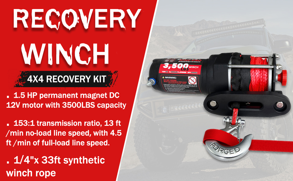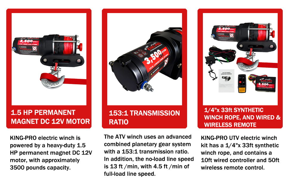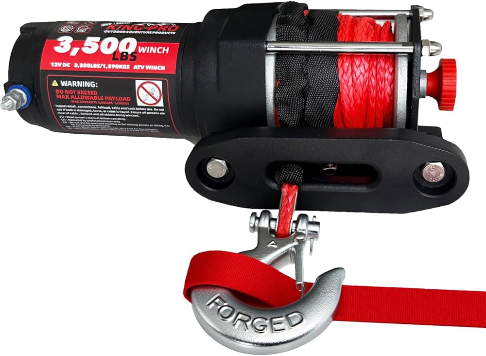 ونش استرداد KING-PRO 3500 رطل ATV UTV، طقم ونش كهربائي 12 فولت مع حبل صناعي 1/4 بوصة × 33 بوصة جهاز تحكم عن بعد سلكي ولاسلكي، IP68 مقاوم للماء للطرق الوعرة