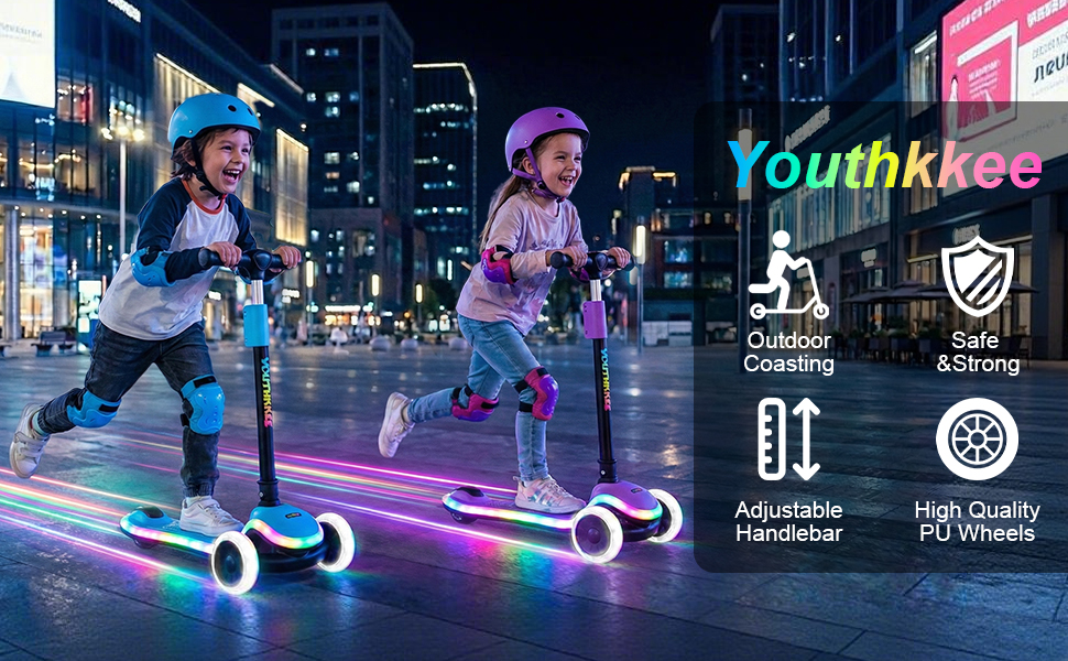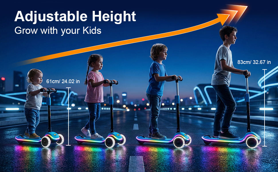 • عرض الضوء المبهر شاهد طفلك يضيئ الحي! يُنشئ هذا السكوتر عرضًا ضوئيًا مذهلاً مع مصابيح LED تعمل بالحركة على العجلات الثلاث وسطح متوهج. ليست هناك حاجة إلى بطاريات - كلما كان ركوب الأطفال أسرع، كلما كانت الأضواء أكثر سطوعًا! هذه الميزة الجذابة لا تضيف الإثارة فحسب، بل تزيد أيضًا من الرؤية بشكل كبير من أجل متعة أكثر أمانًا أثناء ركوب الغسق أو المساء.