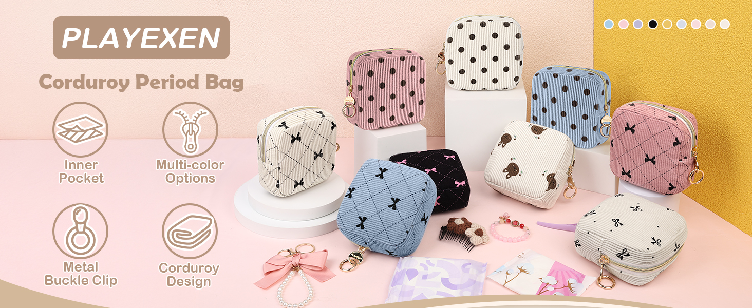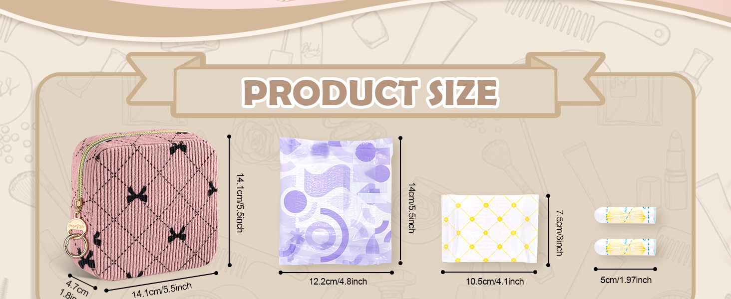 【حجم مناسب 】 القياس: 5.5*1.8*5.5 بوصة. يمكن لحقيبة المناديل الصحية من سروال قصير أن تحمل ما يصل إلى 12 منديلًا صحيًا بالحجم الطبيعي و6 سدادات قطنية في وقت واحد. سواء كنت في المكتب أو في الهواء الطلق أو أثناء السفر، يمكن أن تتناسب حقيبة الفوط الصحية بسهولة مع حقيبتك