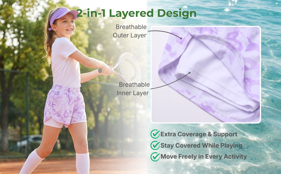 • تصميم طبقات 2 في 1 مسامي: طبقة خارجية شبكية مطبوعة خفيفة الوزن تحافظ على برودة الأطفال؛ الشورت الداخلي ناعم ومطاط ولطيف على البشرة من أجل حركة خالية من القلق.