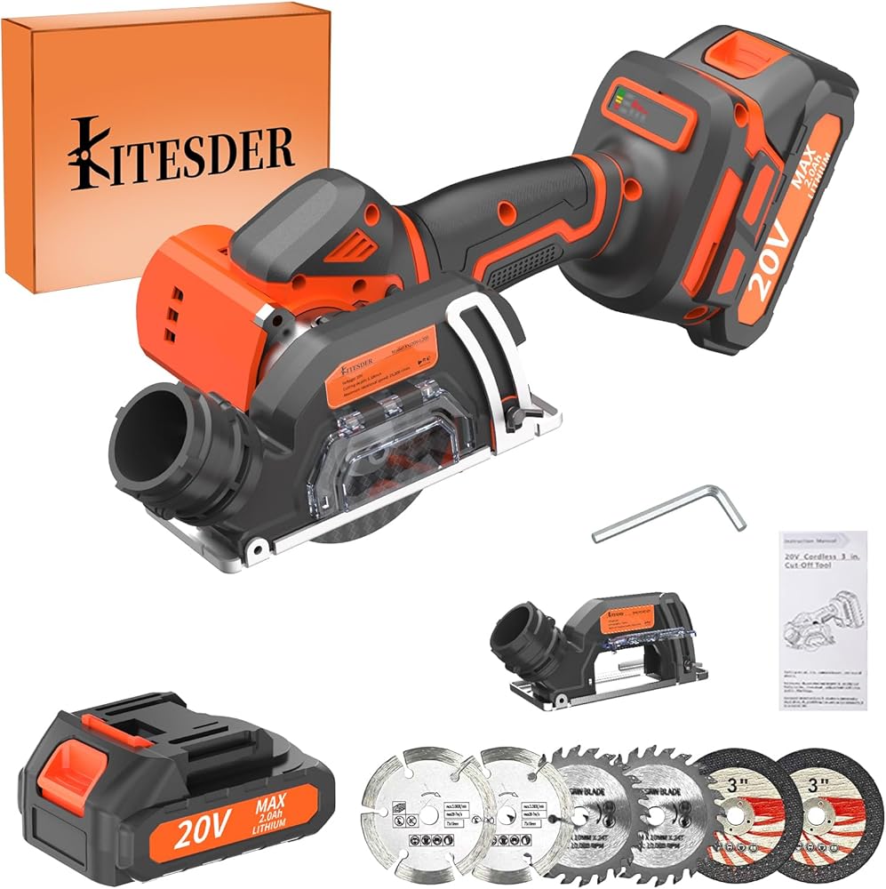 • Brushless 3-Inch Circular Saw Kit - Includes a circular saw, and a battery, charger, comes with 6 saw blades. It features adjustable 45° cutting depth, a safety lock.