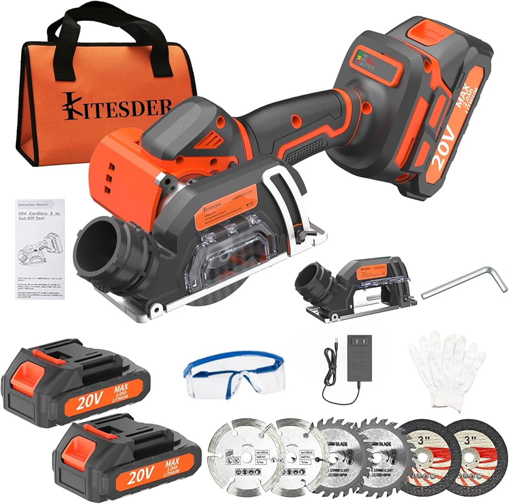 Brushless 3-Inch Circular Saw Kit - Includes a circular saw, two batteries, and a battery charger,bag, comes with 6 saw blades. It features adjustable 45° cutting depth, a safety lock.