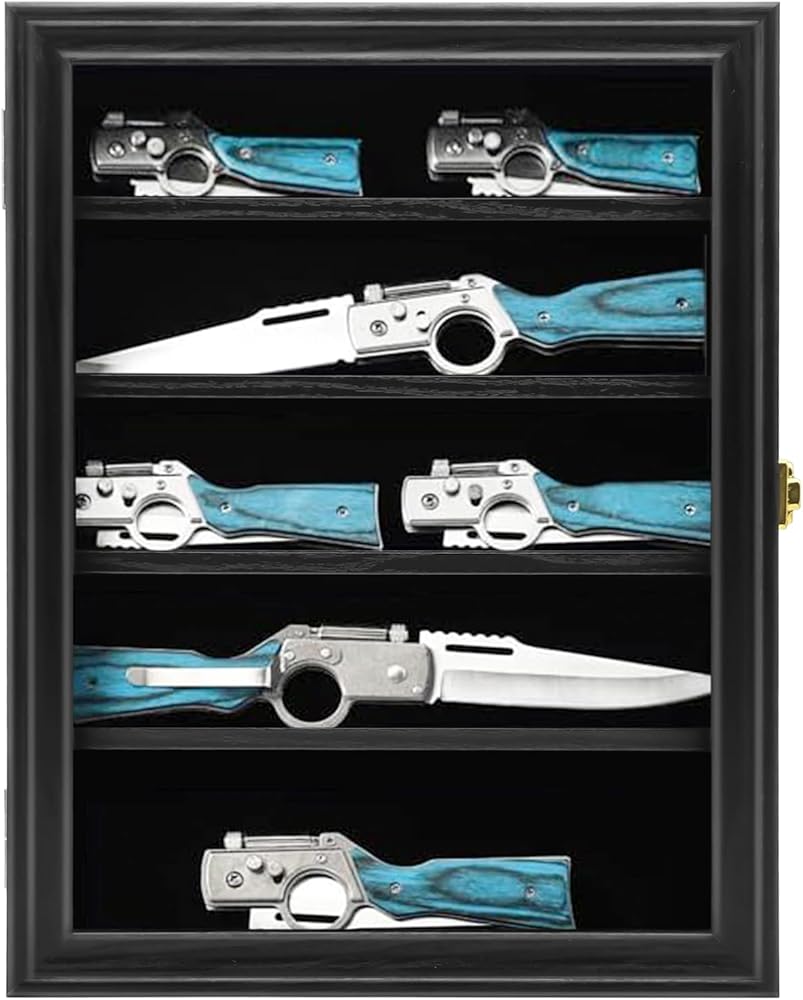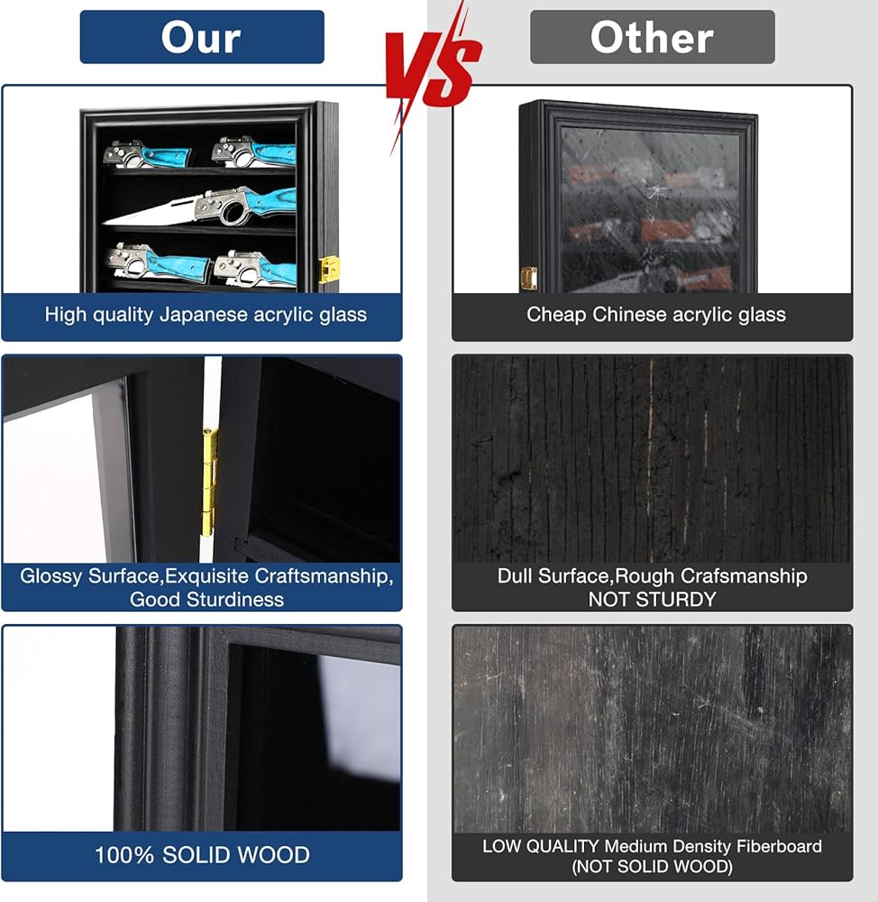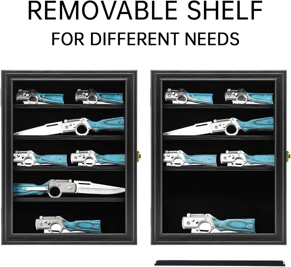 【HIGH QUALITY MATERIALS】- pocket knife display case is made of premium wood with ultra transparent Acrylic Window, providing plenty of space to display your precious keepsakes. Tear off the acrylic protection film before use,180 degree HD stereo display!Knife Display Cabinets are designed to store your precious knives or for a growing collection.