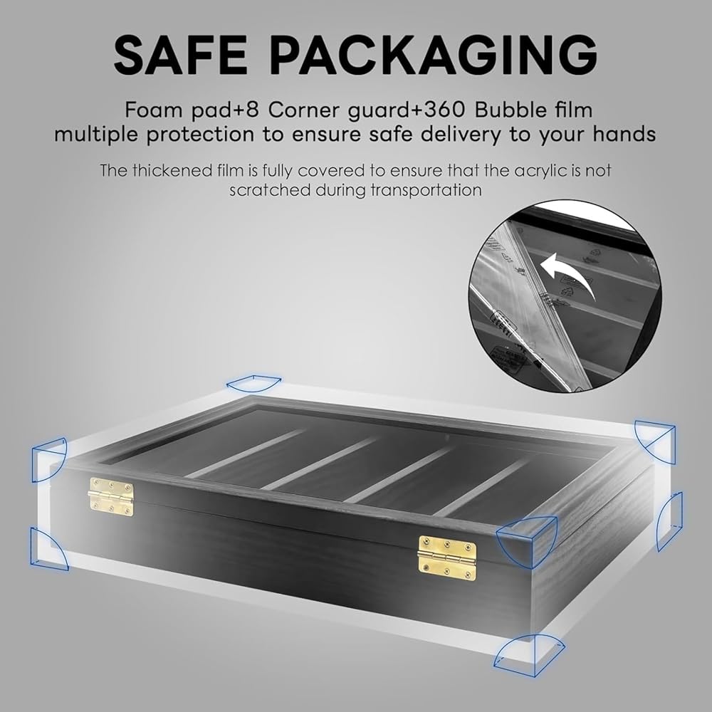 【SAFETY PACKAGING】- The knife display cabinet is surrounded by foam 360 degrees to be fully protected. The acrylic panel is covered with a thick protective sticker to prevent scratches during transportation.