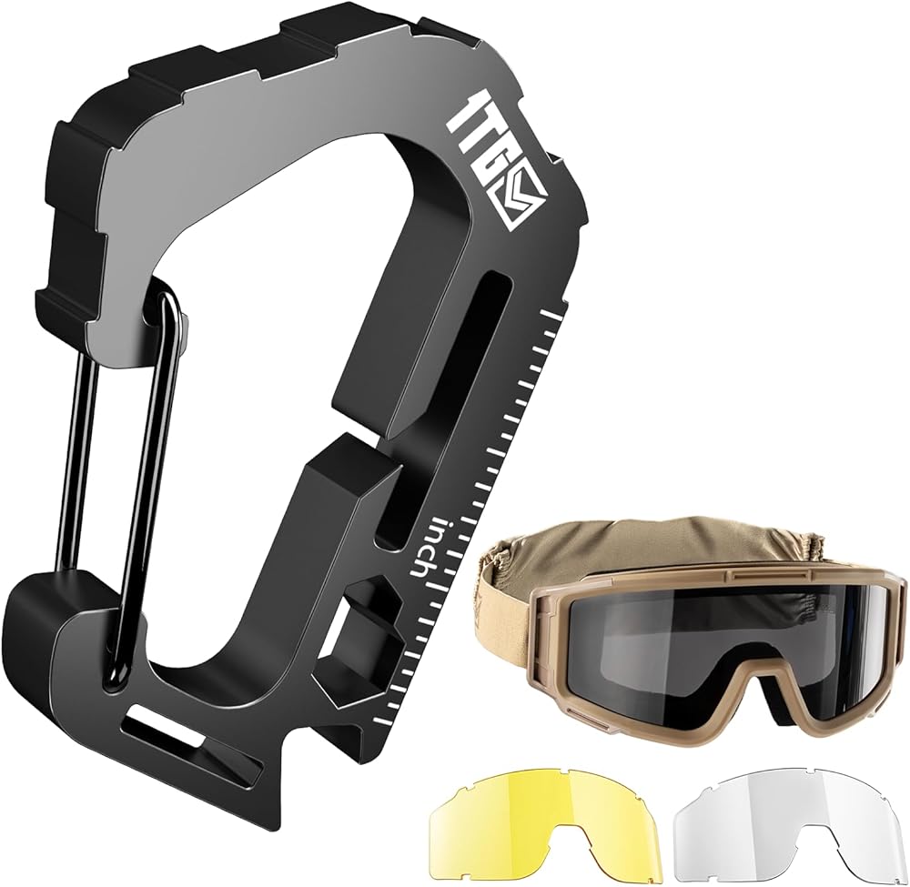 440LB Heavy Duty 304 Stainless Steel MOLLE Clip & Anti-Fog Airsoft Goggles with 3 Interchangeable Impact-Resistant Lenses, 7-in-1 EDC Multi-Tool Set for Shooting, Hunting, Hiking