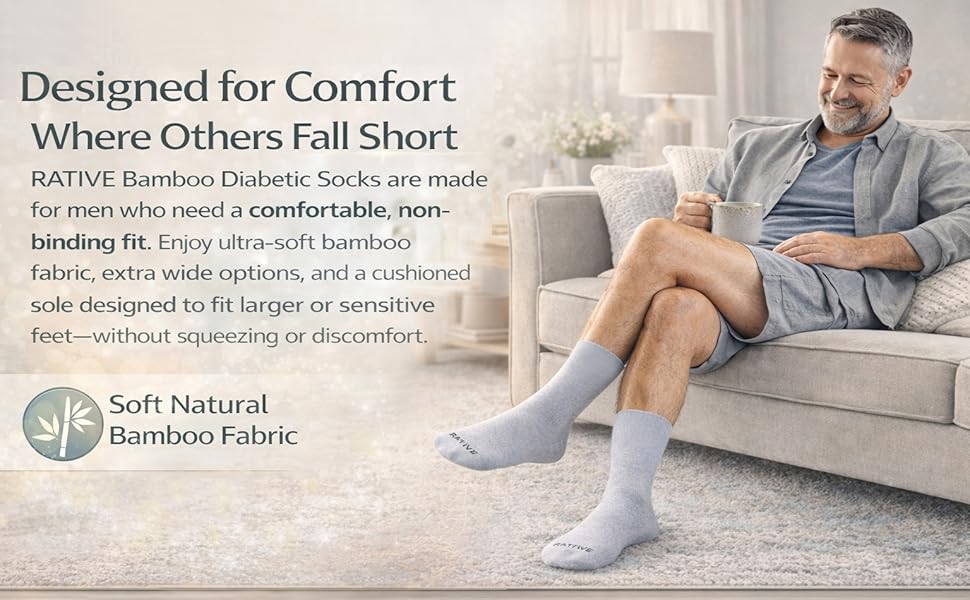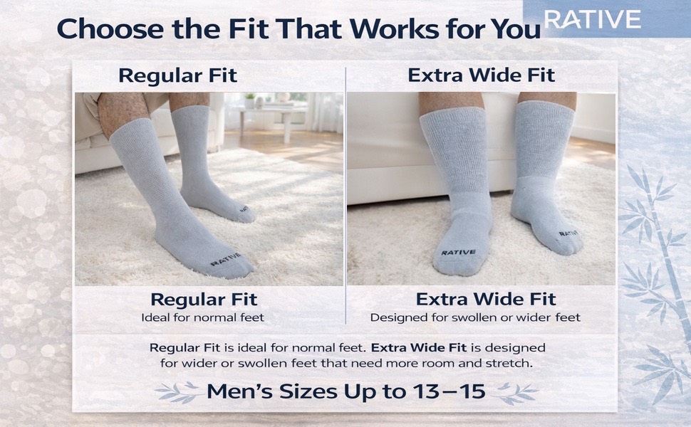 مقاس عادي وواسع للغاية - يتمدد حتى 30%، متوفر بمقاس عادي ومقاس عريض جدًا، مصمم ليمتد حتى 30% للأقدام المتورمة أو الحساسة. يوفر التصميم غير المقيد راحة مناسبة للدورة الدموية دون ترك علامات، مما يجعل هذه الجوارب مريحة للارتداء طوال اليوم.