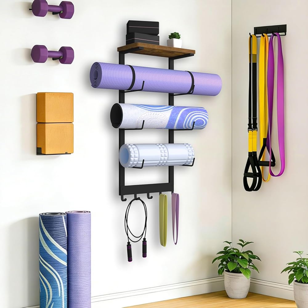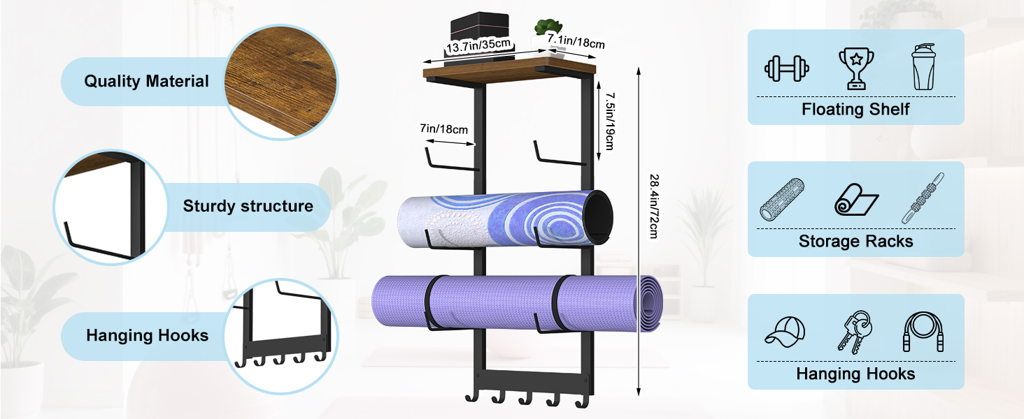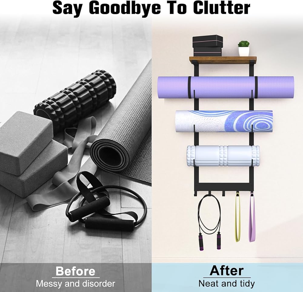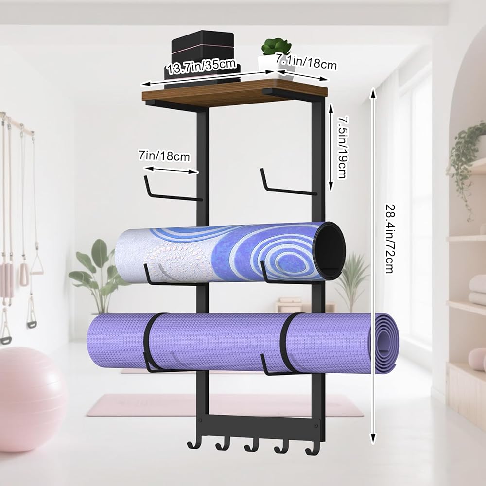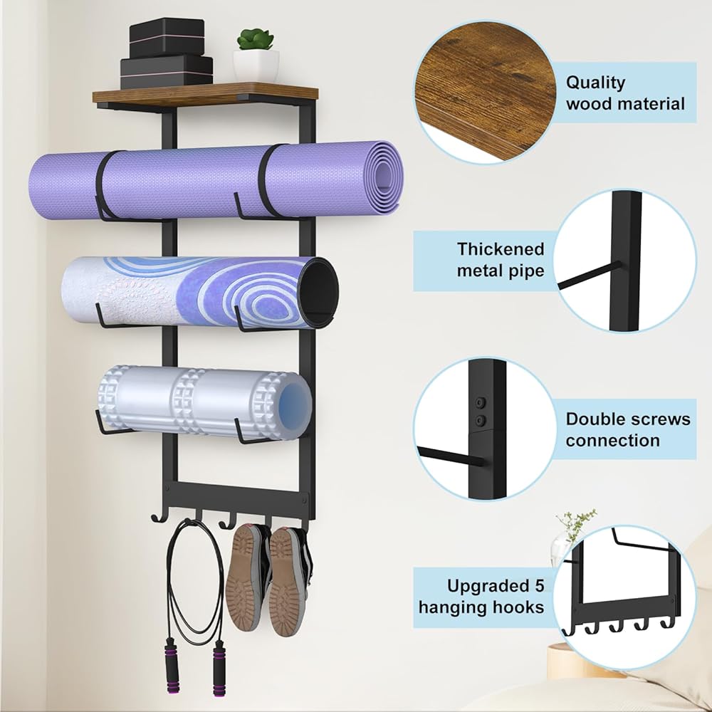 【Large Capacity - 4 Tier Storage】This yoga mats storage holder is equipped with a floating shelf and 4 racks, which is suitable for different sizes yoga mats and foam rollers. As a nifty display rack for display your gym equipment: the wooden shelf on the top is convenient for placing sports trophies, fitness blocks or yoga decor; the bottom with 5 hooks, can hang your hand towels, resistance bands, yoga mat bag and more accessories