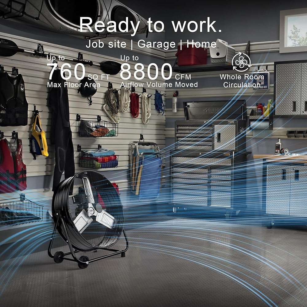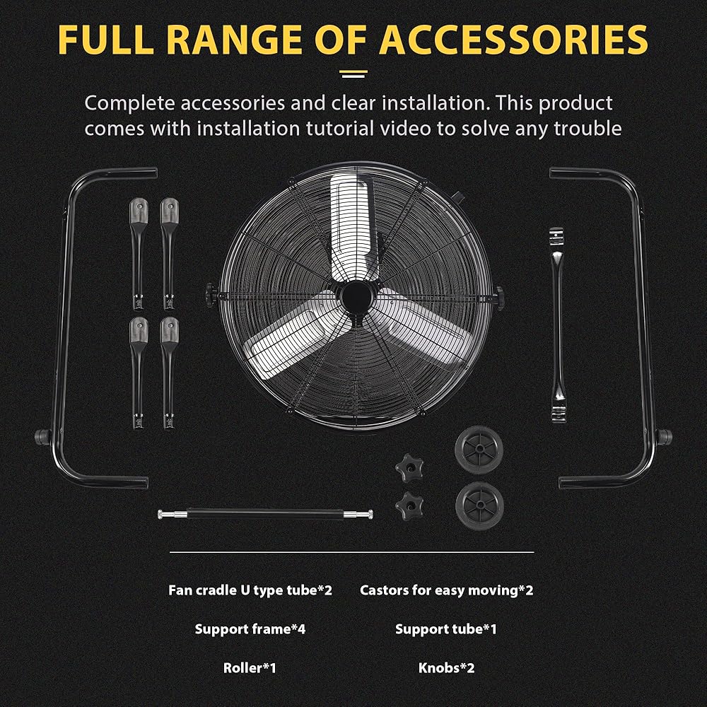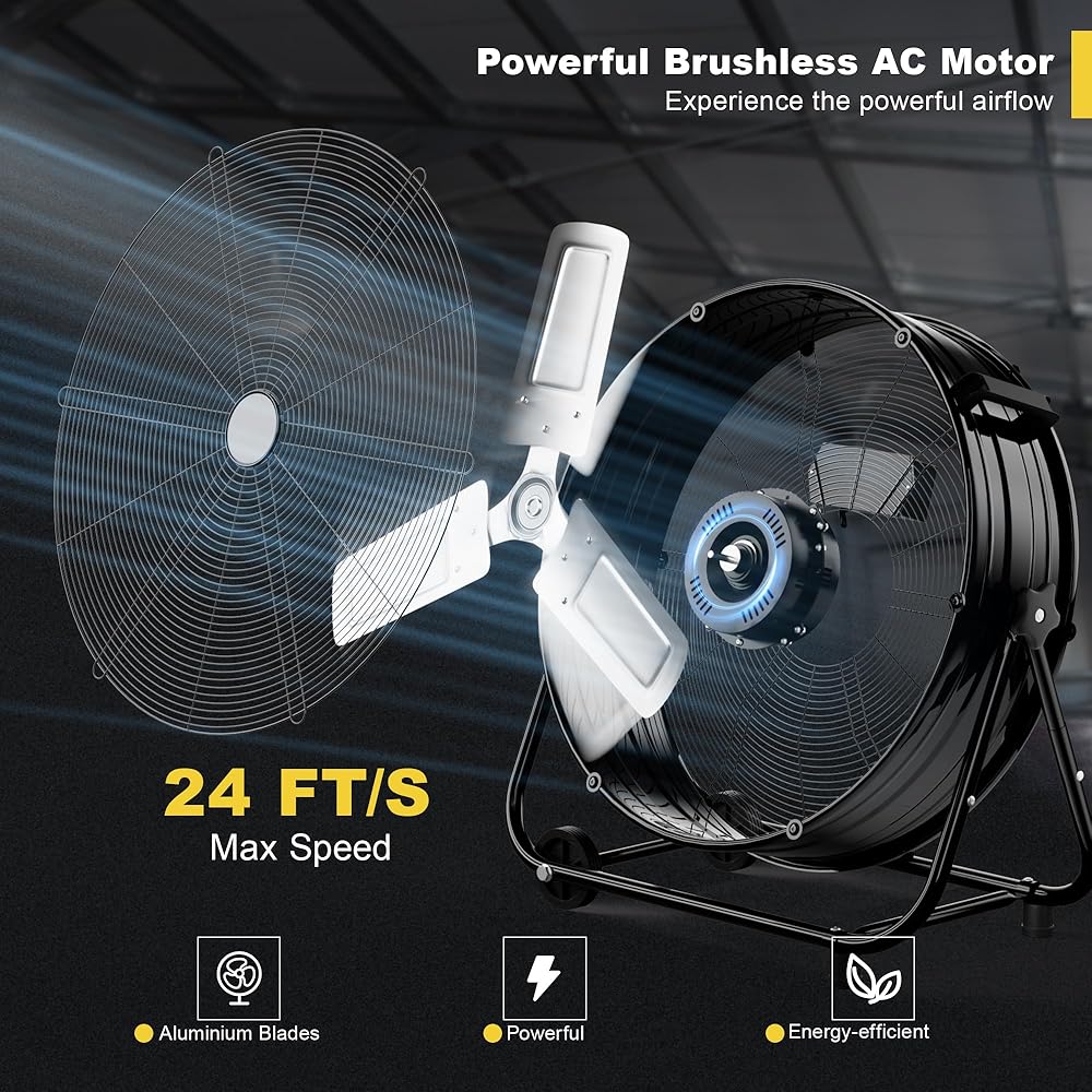 24 Inch High Velocity Industrial Floor Fan with Metal Construction, 8800CFM Heavy Duty Drum Fan for Garage Shop Warehouse, Large Commercial Barrel with 3-Speed, 360°Tilt Castors, Black