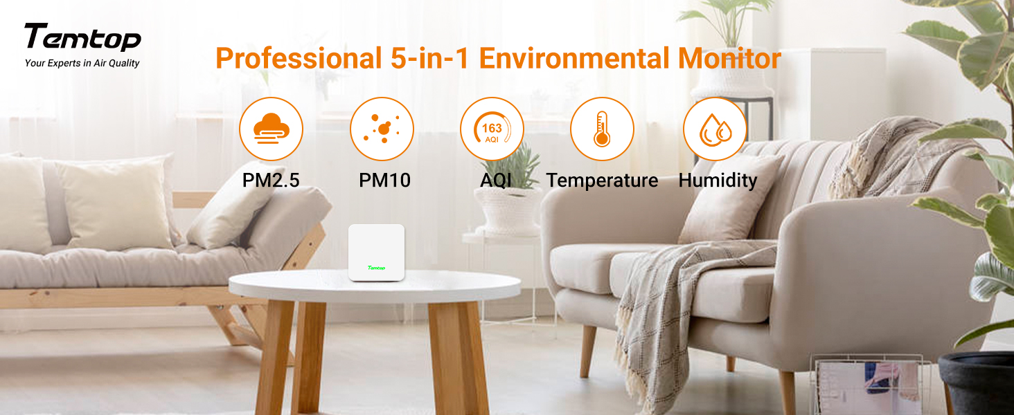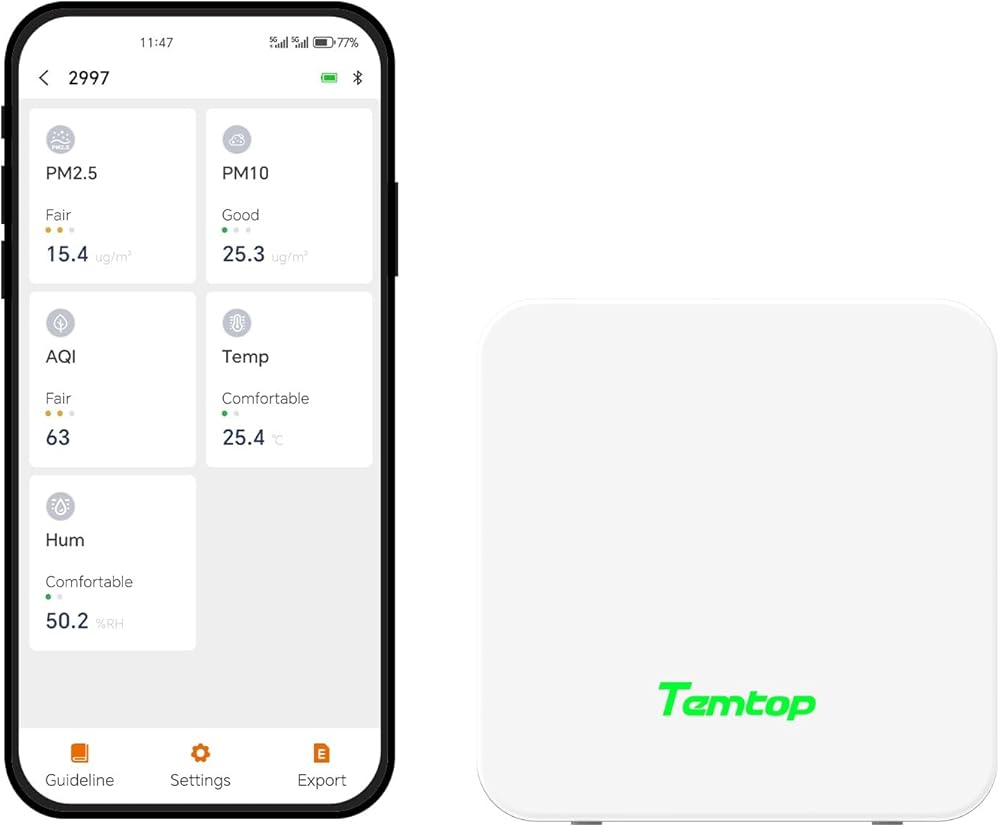 مراقبة شاملة في الوقت الفعلي: تتبع PM2.5، وPM10، ودرجة الحرارة، والرطوبة، وAQI في الوقت الفعلي — جميع مقاييس جودة الهواء الرئيسية في جهاز واحد صغير الحجم.