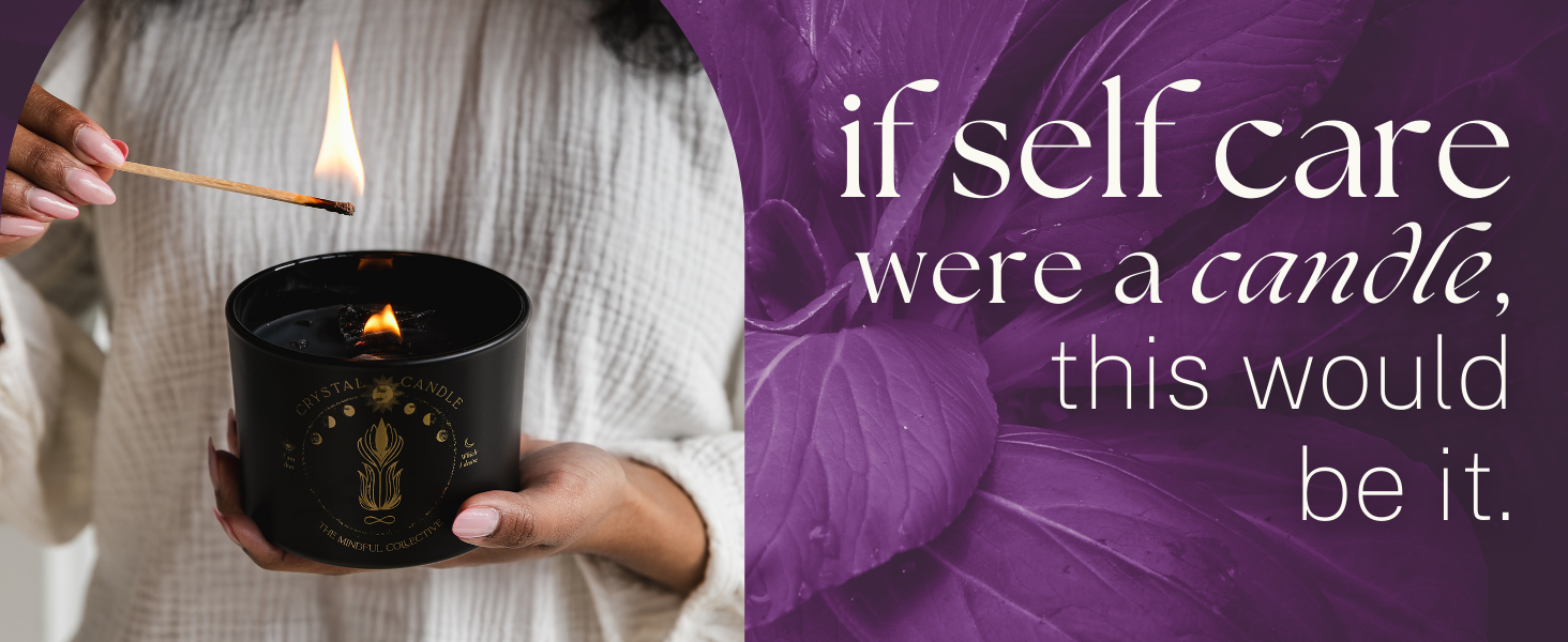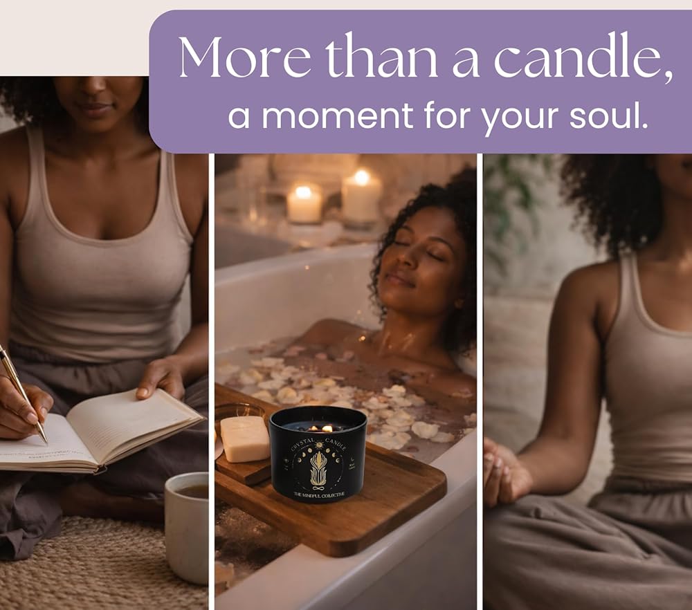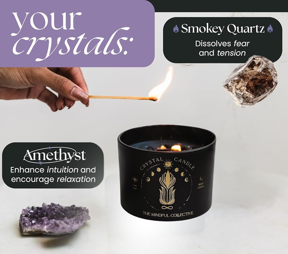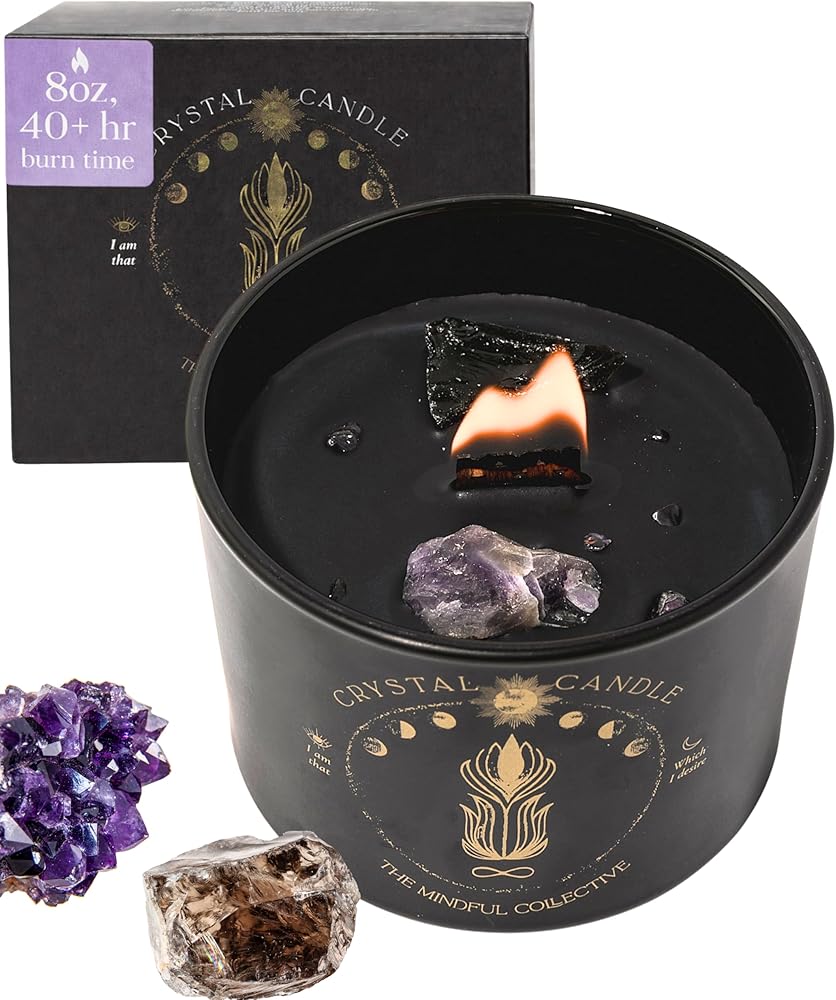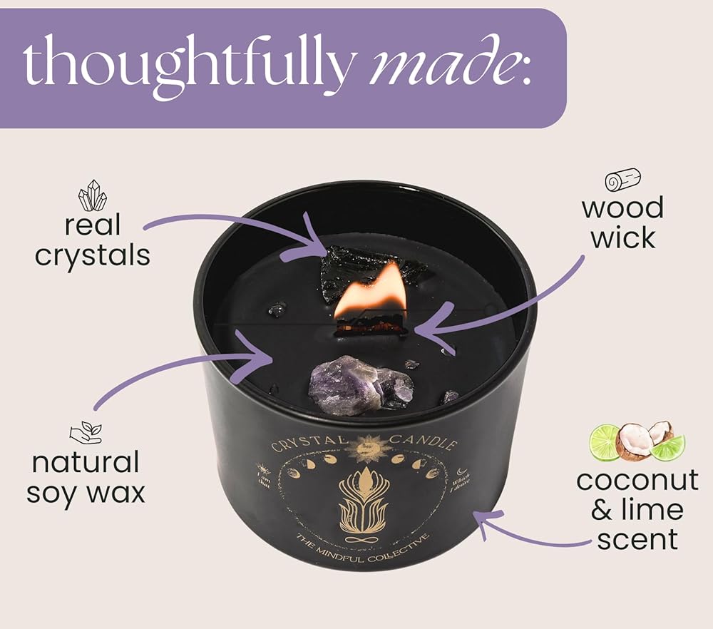 شمعة كريستال سوداء للنساء - شمعة فتيل خشبية بوزن 8 أونصة تتشقق بشمع الصويا الطبيعي. حرق بطيء فاخر، للتأمل. يشتمل على كريستالات الجمشت والكوارتز الدخاني