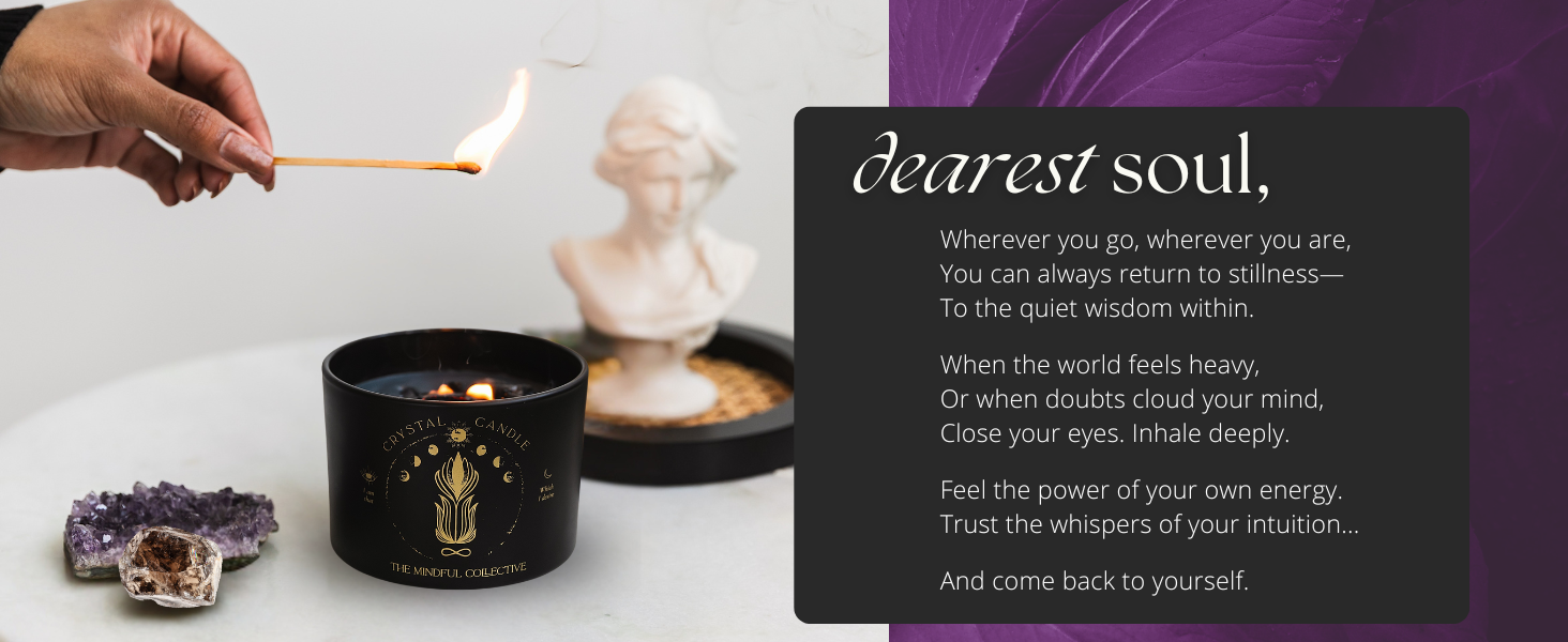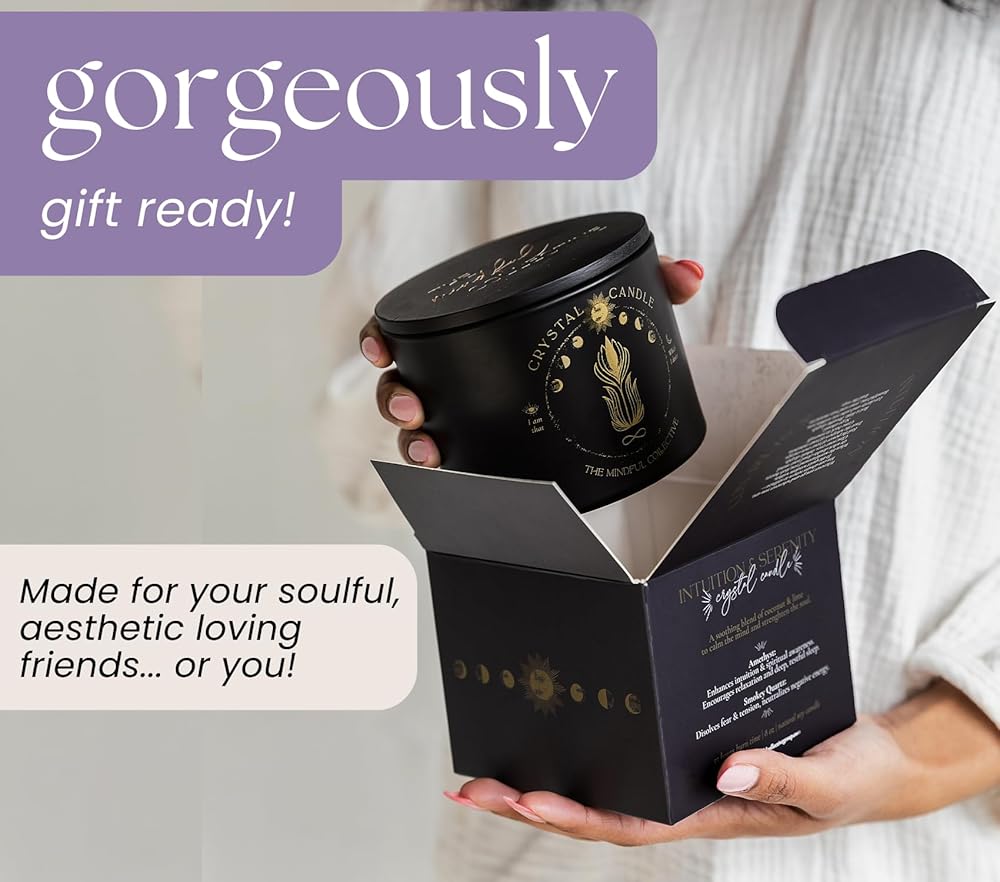 • قم بتنشيط معرفتك الداخلية - هذه الشمعة الكريستالية الفاخرة مشبعة بالجمشت والكوارتز الدخاني لدعم الحدس والوضوح العاطفي والصفاء. مصممة للطقوس الروحية أو التأمل الهادئ، إنها الشمعة السوداء المثالية للنساء اللاتي يبحثن عن العمق والمحاذاة.