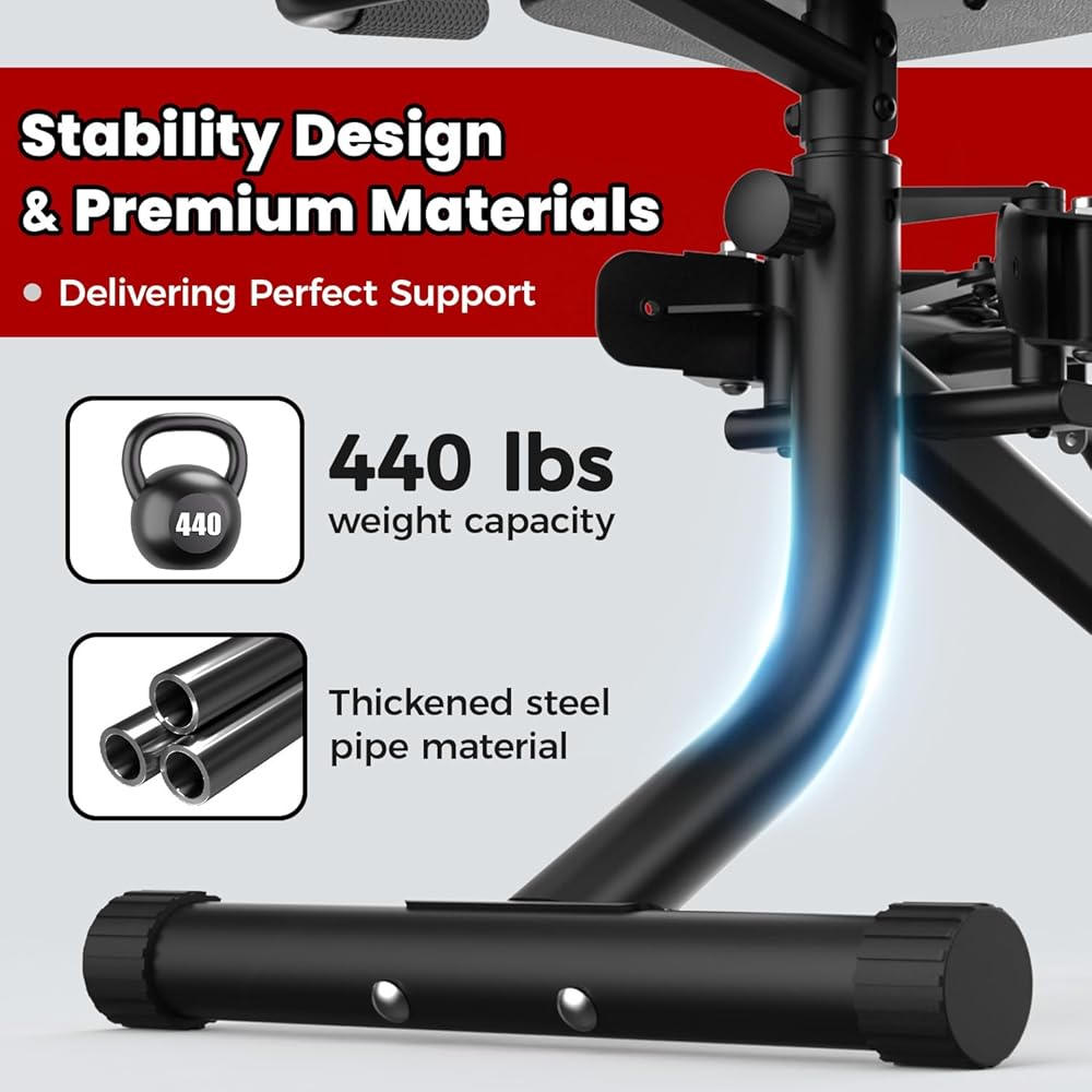 إطار فولاذي مقوى لتعزيز الثبات: يتميز هذا التصميم بإطار فولاذي مثلثي مقوى وأنابيب سميكة، وهو قوي ومتين. مع سعة وزن قصوى تصل إلى 440 رطلاً، تظل معدات التمرين هذه خالية من التذبذب أثناء التمارين، مما يوفر الثبات والأمان في منزلك.
