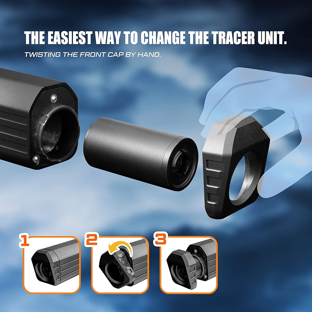 • توافق BB المتوهج في الظلام: مصمم لإضاءة BBs التتبع الأخضر أو ​​BBs الهلامية (الحزمة غير متضمنة bbs) عن طريق إصدار وميض من الضوء عند خروجها من البرميل، مما يعزز الرؤية أثناء اللعب في الإضاءة المنخفضة أو الليلية.