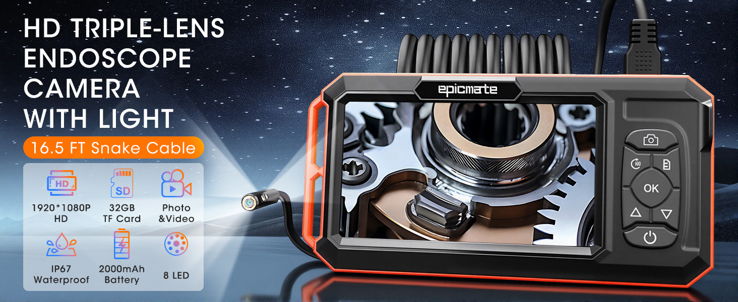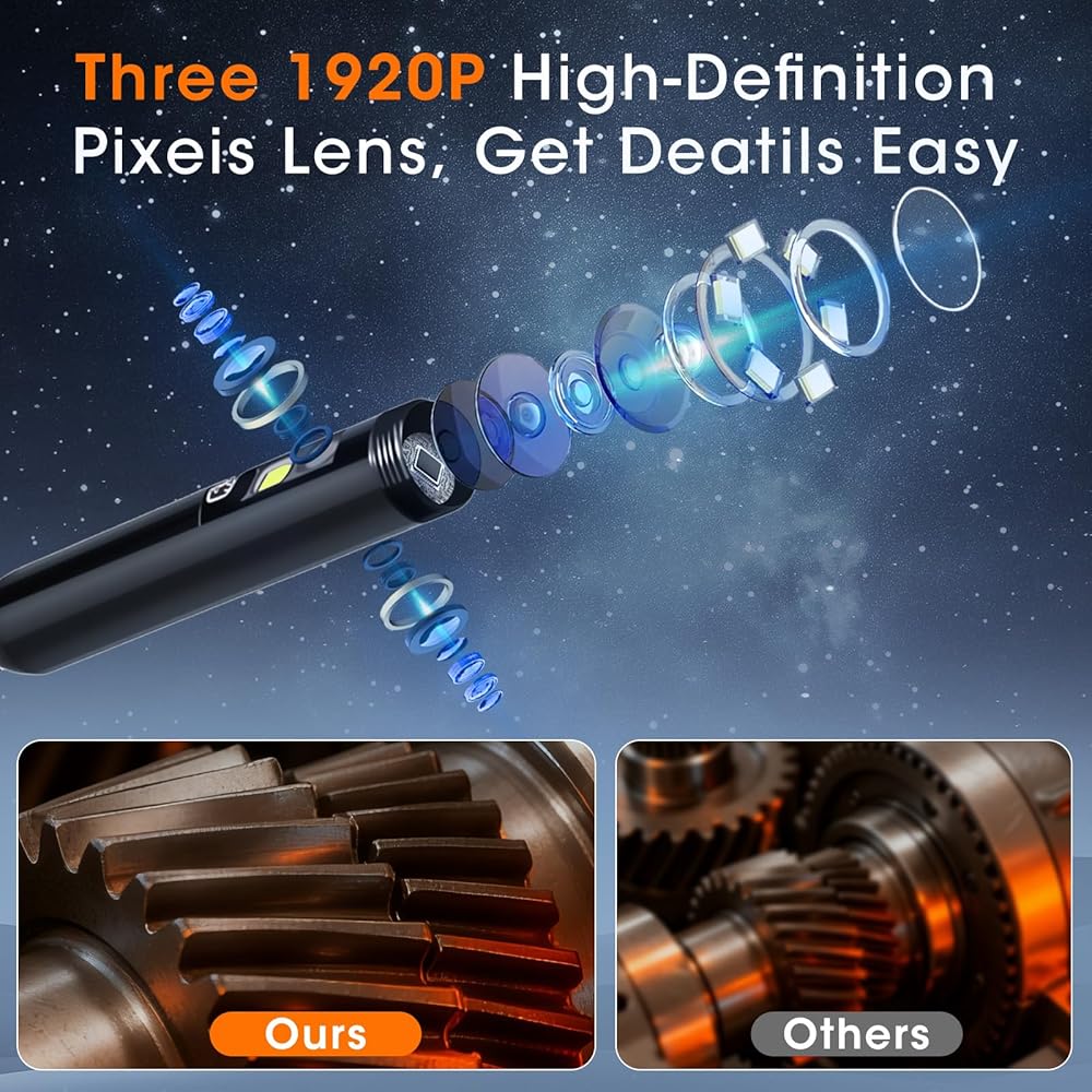 • عدسة ثلاثية عالية الدقة 1920 بكسل: تتميز كاميرا الفحص هذه بتقنية العدسات الثلاثية المتقدمة، ما عليك سوى الضغط على زر للتبديل بين ثلاث عدسات. لا تحتاج إلى ضبط الكابل بعدسة واحدة، يمكنك استخدام منظار الفحص هذا للتحقق من كل زاوية بسهولة وتحديد المشكلات بسرعة.
