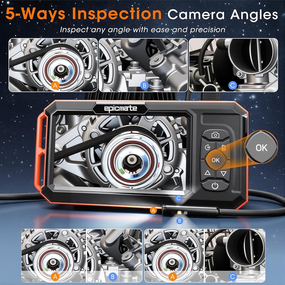 • زوايا الكاميرا وملحقاتها بخمسة اتجاهات: تحتوي كاميرا المنظار المزودة بالضوء على 5 طرق لعرض المكان الذي تريد فحصه. ثلاث عدسات A وB وC بالإضافة إلى A+B وA+C للعثور على نقطة المشكلة وحل الصعوبات بسهولة. تم تجهيز كاميرا borescope المزودة بالضوء أيضًا بثلاثة ملحقات.