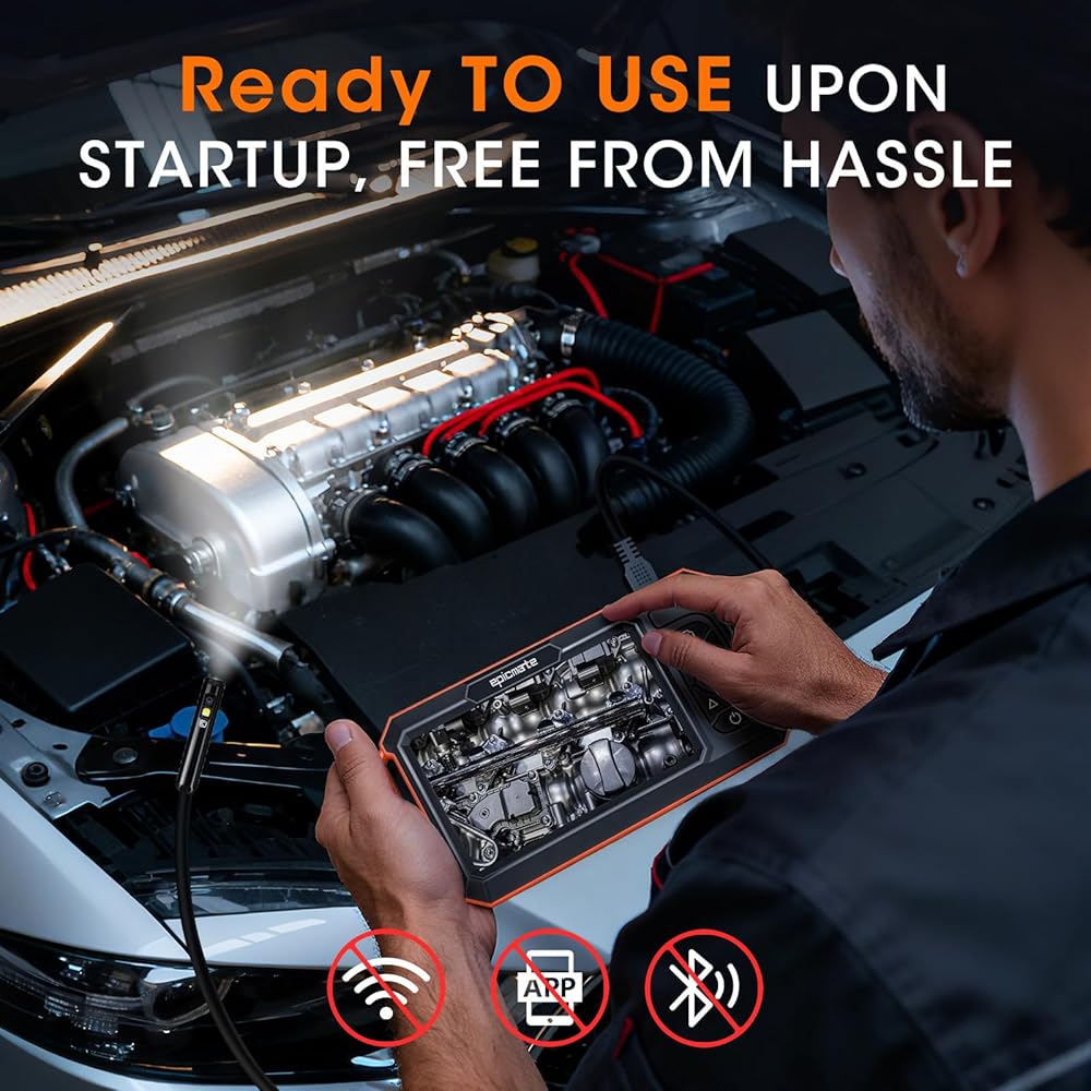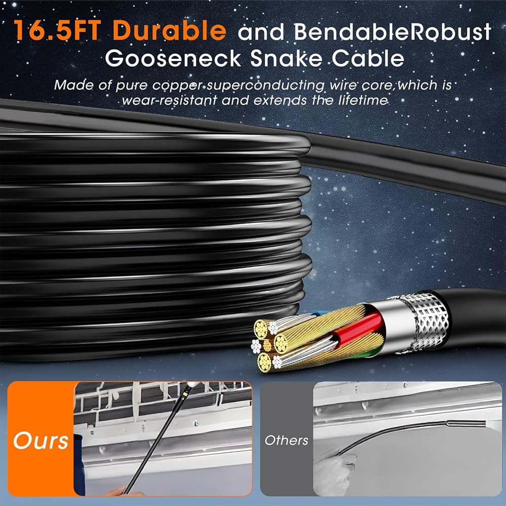 • كابل صلب بطول 16.4 قدم وتصنيف IP67 مقاوم للماء: تم تصميم الكاميرا الأنبوبية بكابل شبه صلب يمتد حتى 16.4 قدم (حوالي 5 أمتار)، تصل كاميرا الثعبان هذه إلى المساحات الضيقة بسهولة. يضمن المسبار المقاوم للماء IP67، المقترن بـ 8 مصابيح LED قابلة للتعديل، رؤية واضحة في البيئات المظلمة أو الرطبة - مثالي للصرف الصحي والأنابيب والصرف والجدار والسيارات.