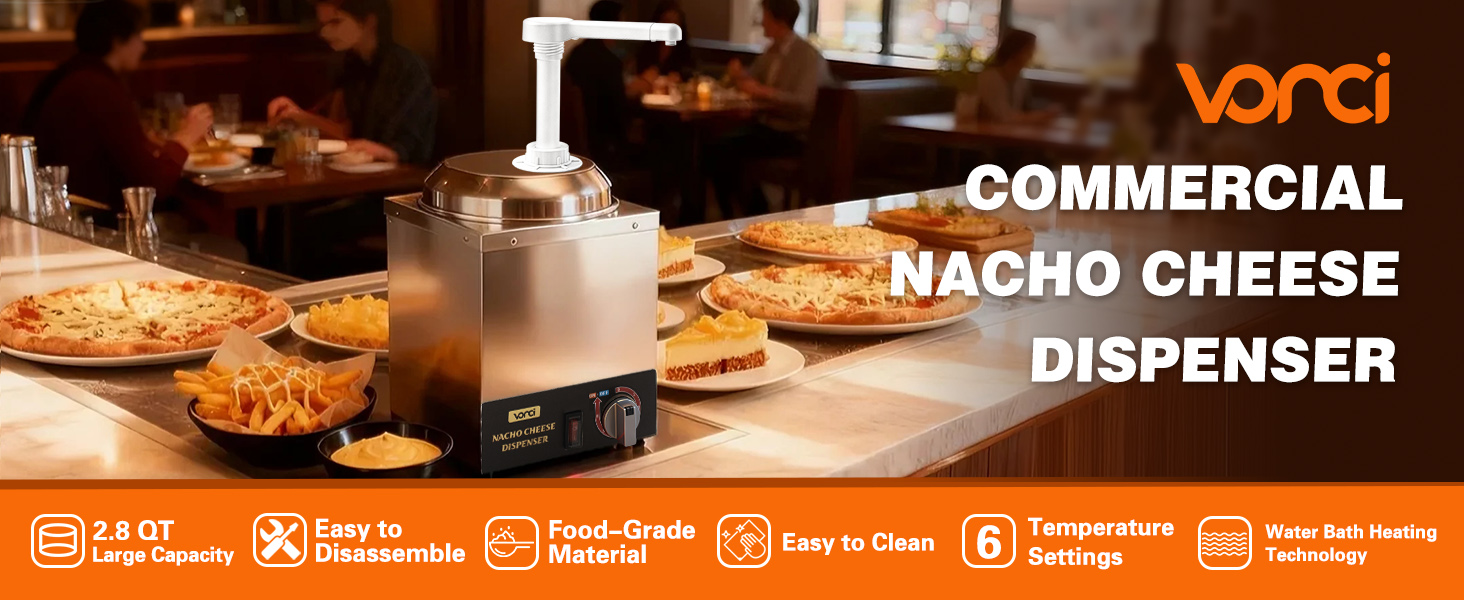 استخدامات متعددة: يعمل جهاز تسخين الجبن هذا على إذابة الجبن دون عناء وتسخين الصلصات المختلفة مثل الفدج وصلصة الشوكولاتة والكراميل، مما يوفر استخدامات متعددة مع جهاز واحد. مثالية لمنافذ الوجبات السريعة والمطاعم وبارات الوجبات الخفيفة ومحلات الآيس كريم، فهي تمكن أزواج الطهي المتنوعة والإبداعات المبتكرة، لتصبح حليف مطبخك الذي لا غنى عنه لإمكانيات لا حصر لها. كما أنها مثالية للتجمعات المنزلية، مما يجعلها مناسبة أيضًا للاستخدام التجاري والمنزلي.