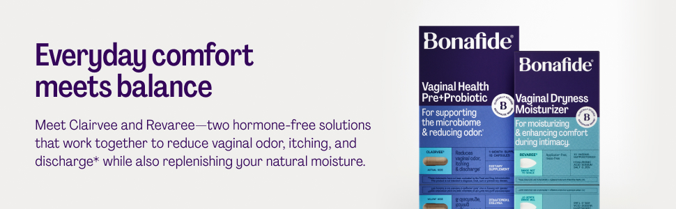 Bonafide Clairvee + Revaree - خالي من الهرمونات والأدوية لتخفيف الرائحة والحكة المهبلية والإفرازات + مرطب مهبلي بحمض الهيالورونيك - كمية تكفي لمدة شهر واحد