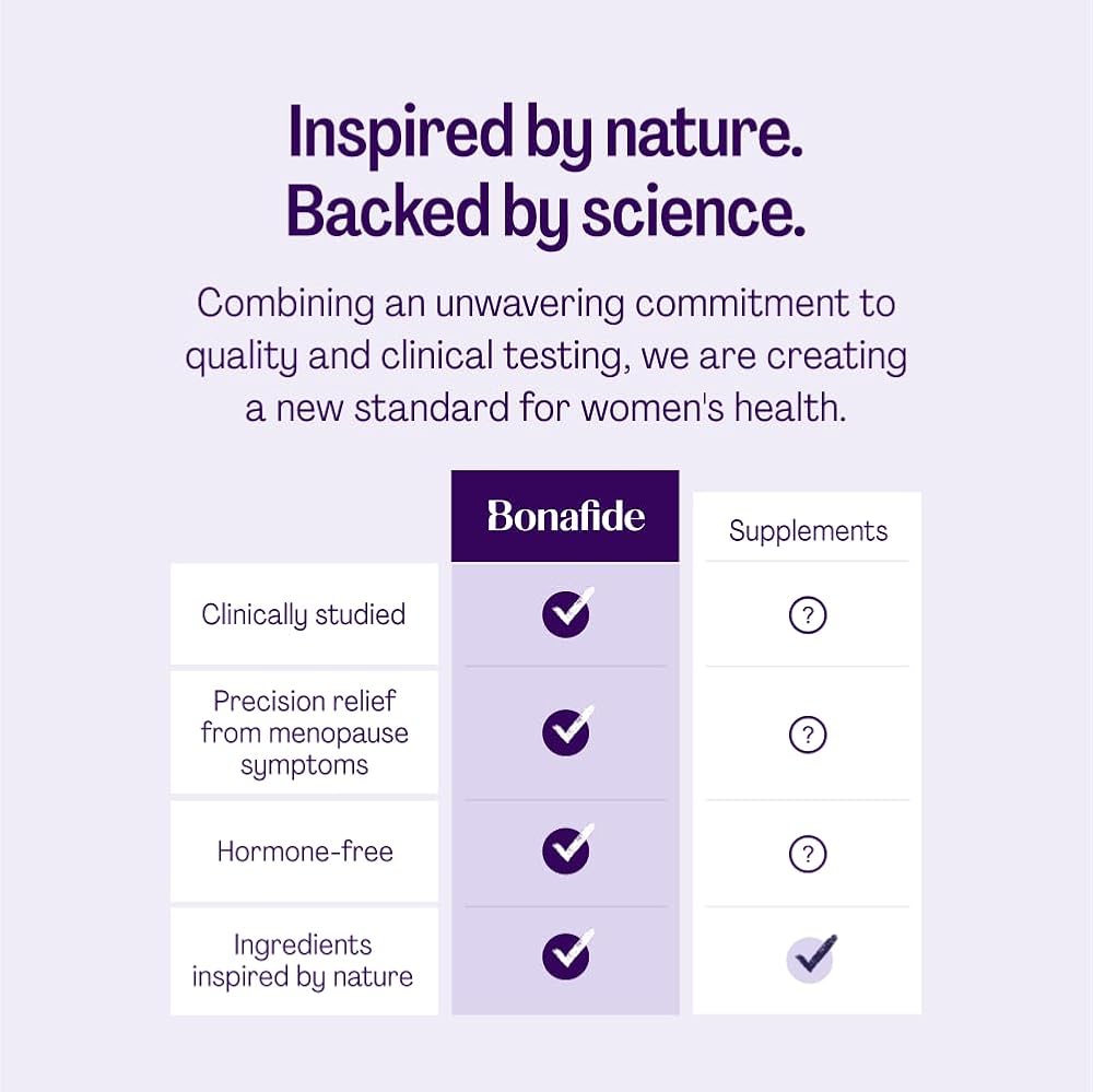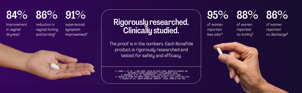 • راحة تغيير الحياة: في دراسة أجريت على 967 من عملاء Bonafide، قال 71% من النساء أن منتجات Bonafide غيرت حياتهم للأفضل، ويقول 97% إنهم سيحيلون المنتجات إلى صديق يعاني من نفس المشكلة.