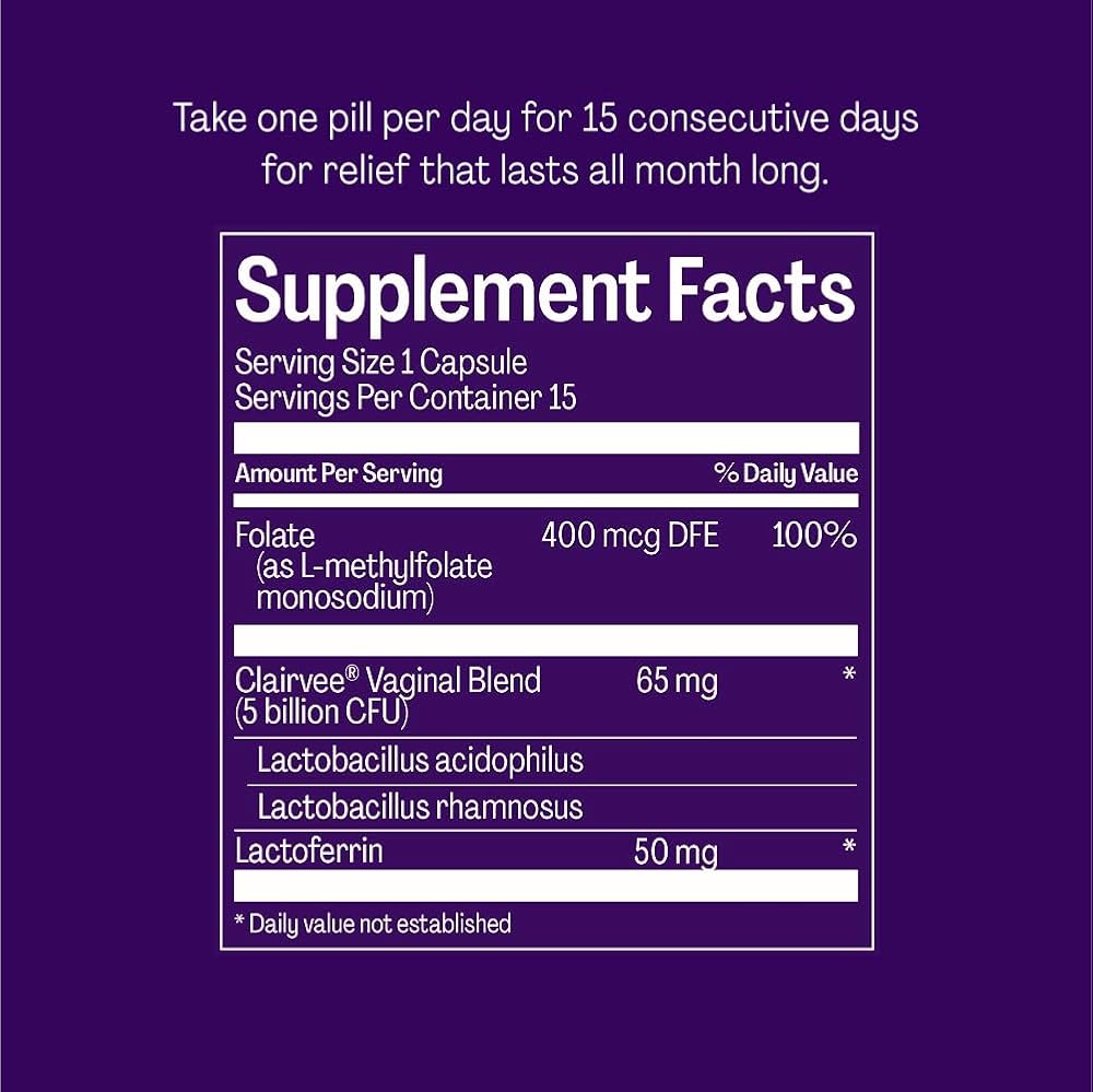 • استعادة التوازن: يحتوي Clairvee على تركيبة بروبيوتيك تم التحقق من صحتها سريريًا لإيقاف الرائحة المهبلية والحكة والإفرازات. ما عليك سوى تناول كبسولة واحدة كل يوم لمدة 15 يومًا متتاليًا لتبدأ في الشعور بالراحة التي تدوم طوال الشهر.*
